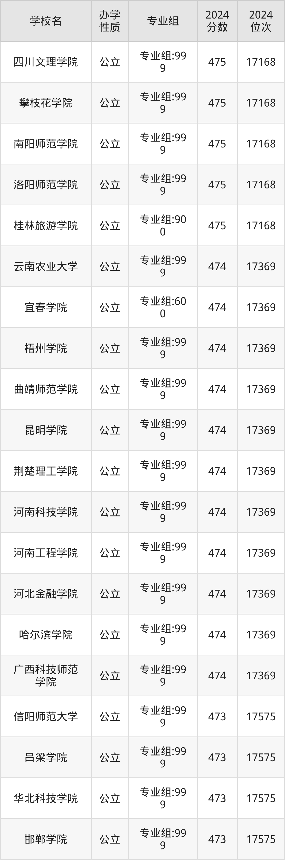 | 昆明学院 | 专业组:99 9 | 474 | 17369 |