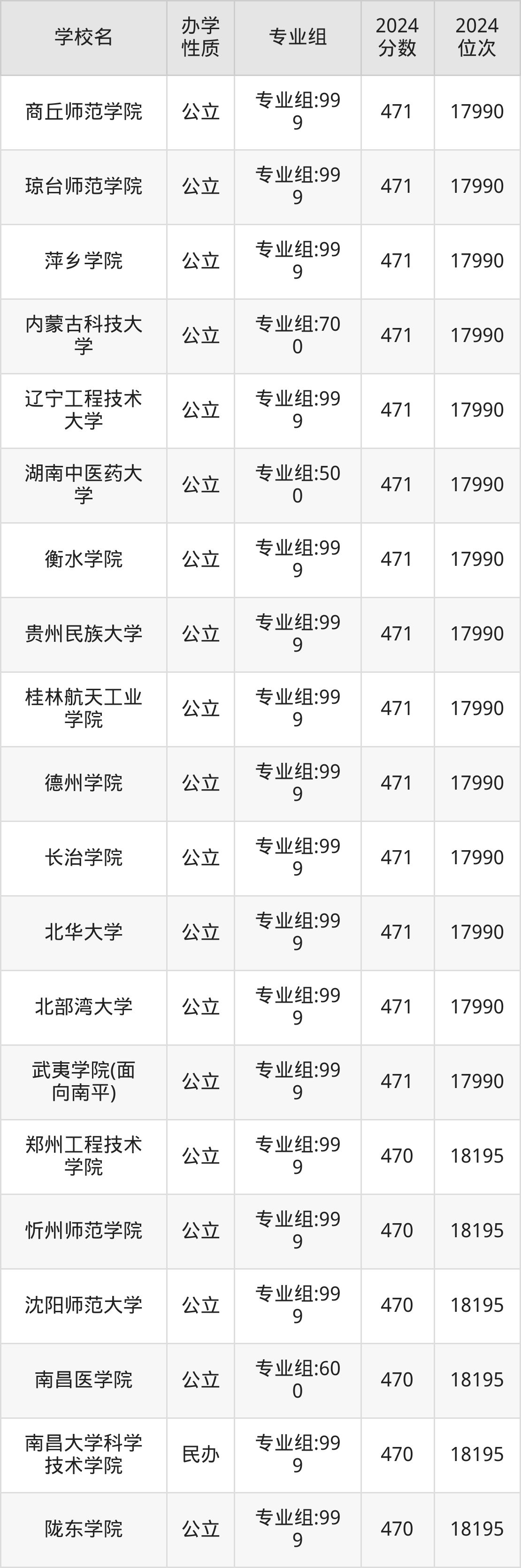 | 陇东学院 | 专业组:99 9 | 470 | 18195 |