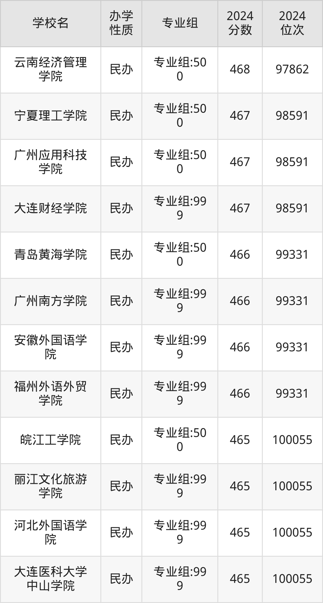 | 丽江文化旅游 学院 | 专业组:99 9 | 465 | 100055 |