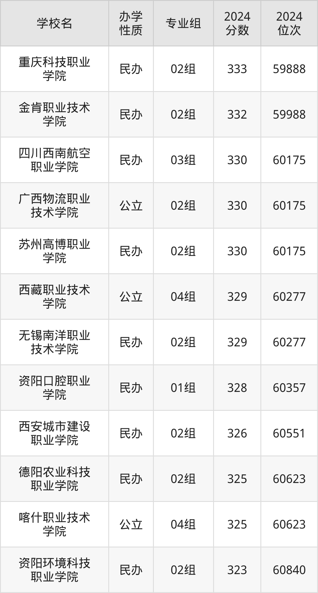 | 西藏职业技术 学院 | 04组 | 329 | 60277 |