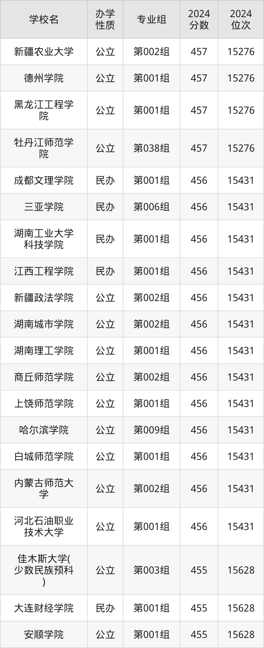 | 佳木斯大学( 少数民族预科 ) | 第003组 | 455 | 15628 |