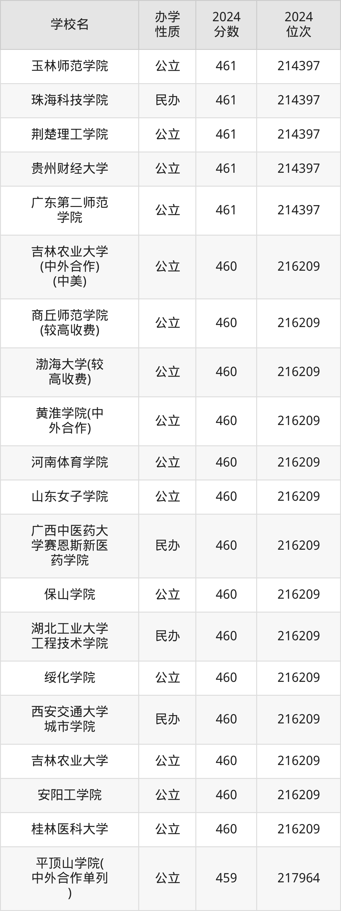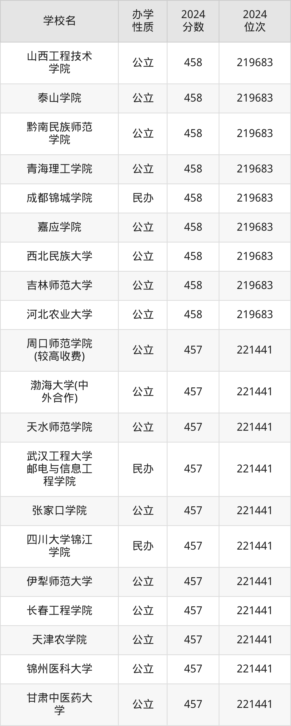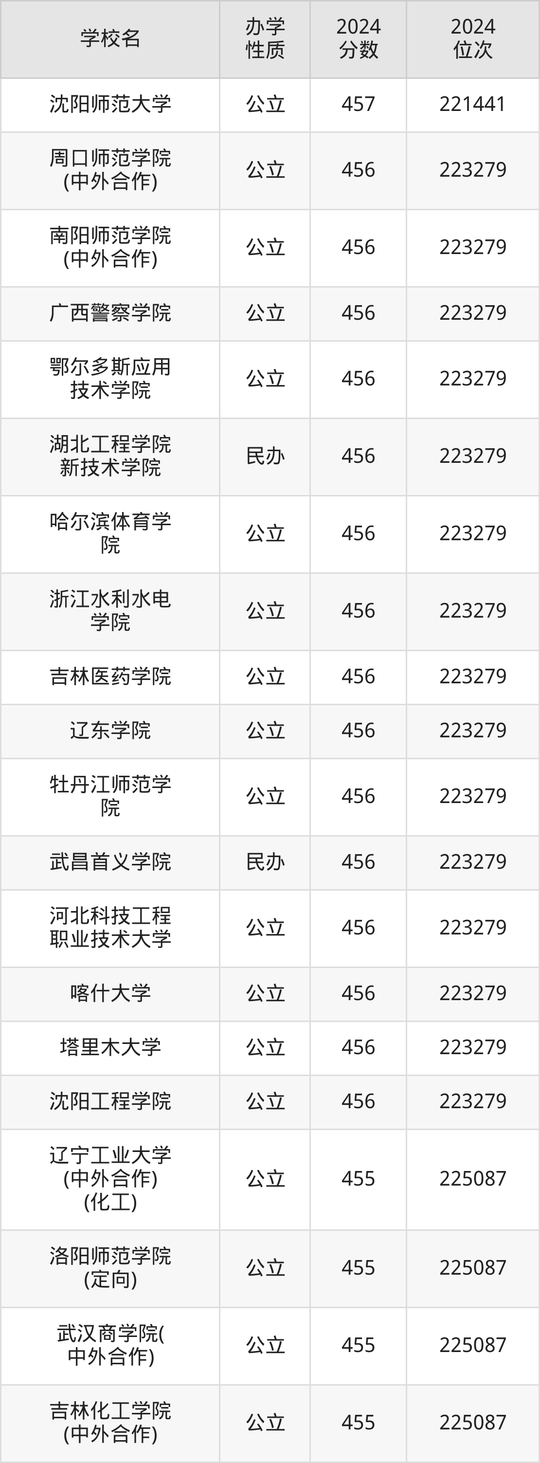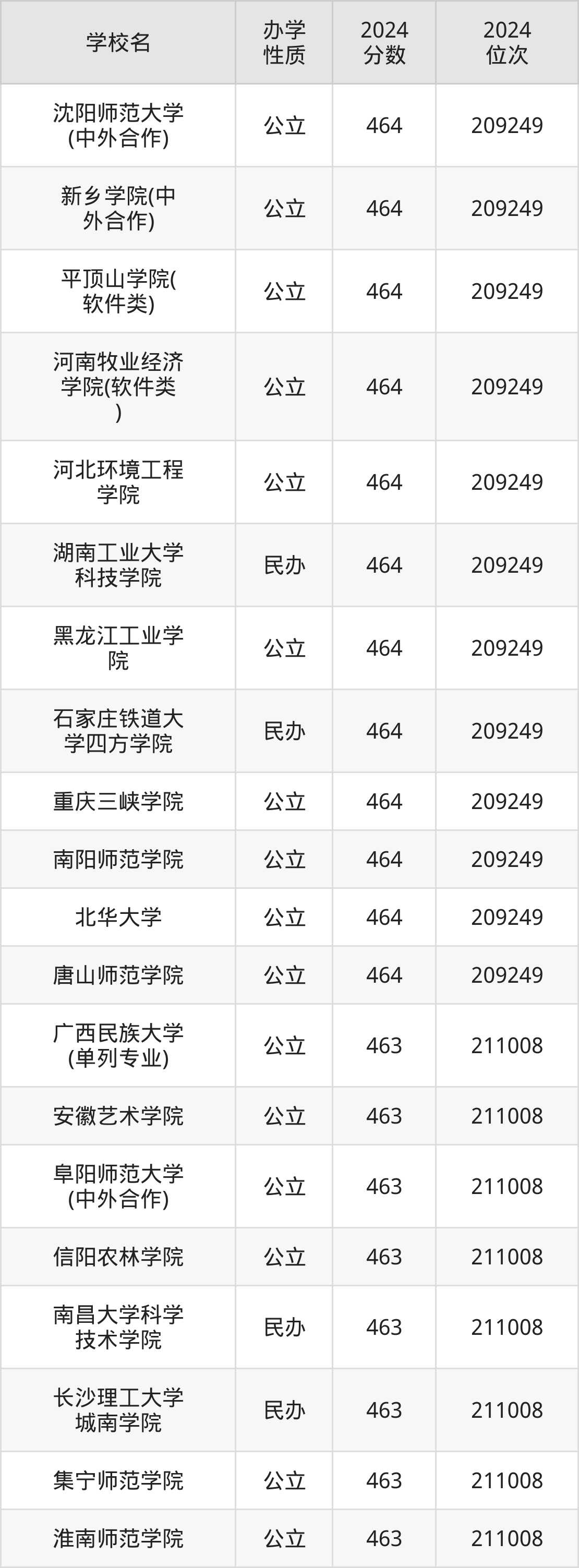 2024年河南理科459分考生能上沈阳师范大学(中外合作)、新乡学院(中外合作)、平顶山学院(软件类)、河南牧业经济学院(软件类)、河北环境工程学院等147所二本院校,具体录取分数线及位次为: