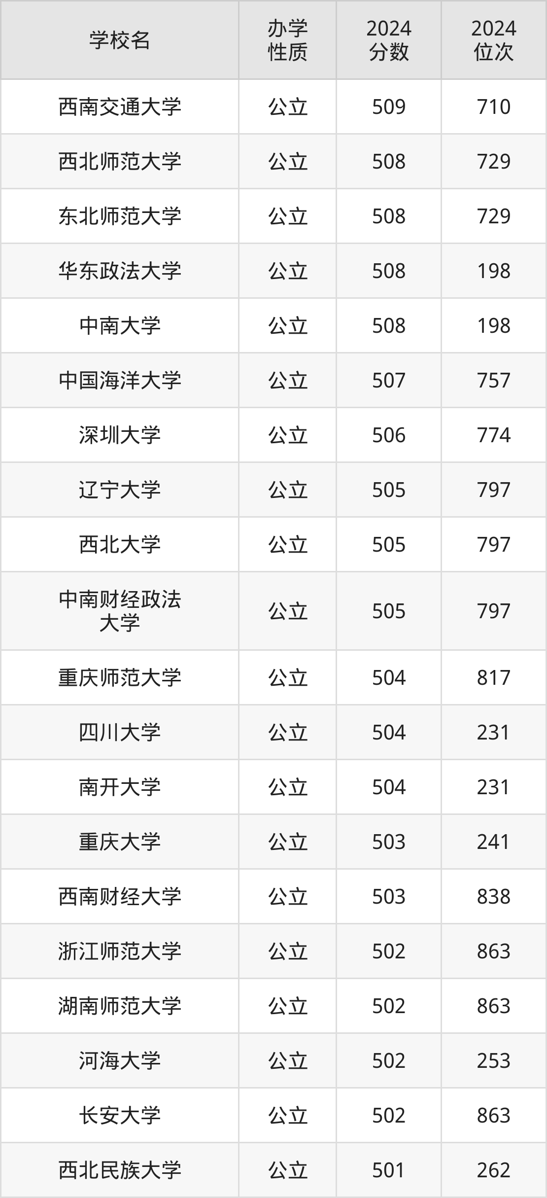 2024年青海文科504分考生能上西南交通大学、西北师范大学、东北师范大学、中国海洋大学、深圳大学等20所一本院校,具体录取分数线及位次为: