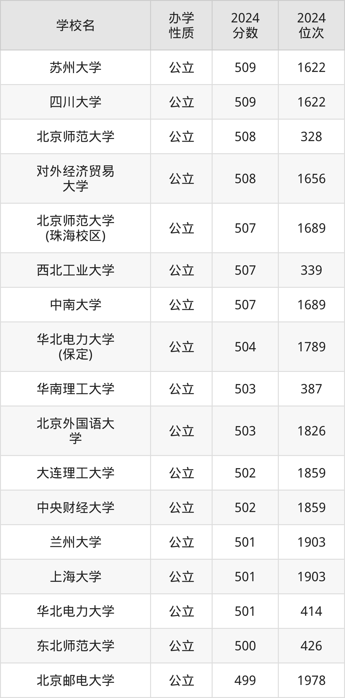 2024年青海理科504分考生能上苏州大学、四川大学、对外经济贸易大学、北京师范大学(珠海校区)、中南大学等12所一本院校,具体录取分数线及位次为: