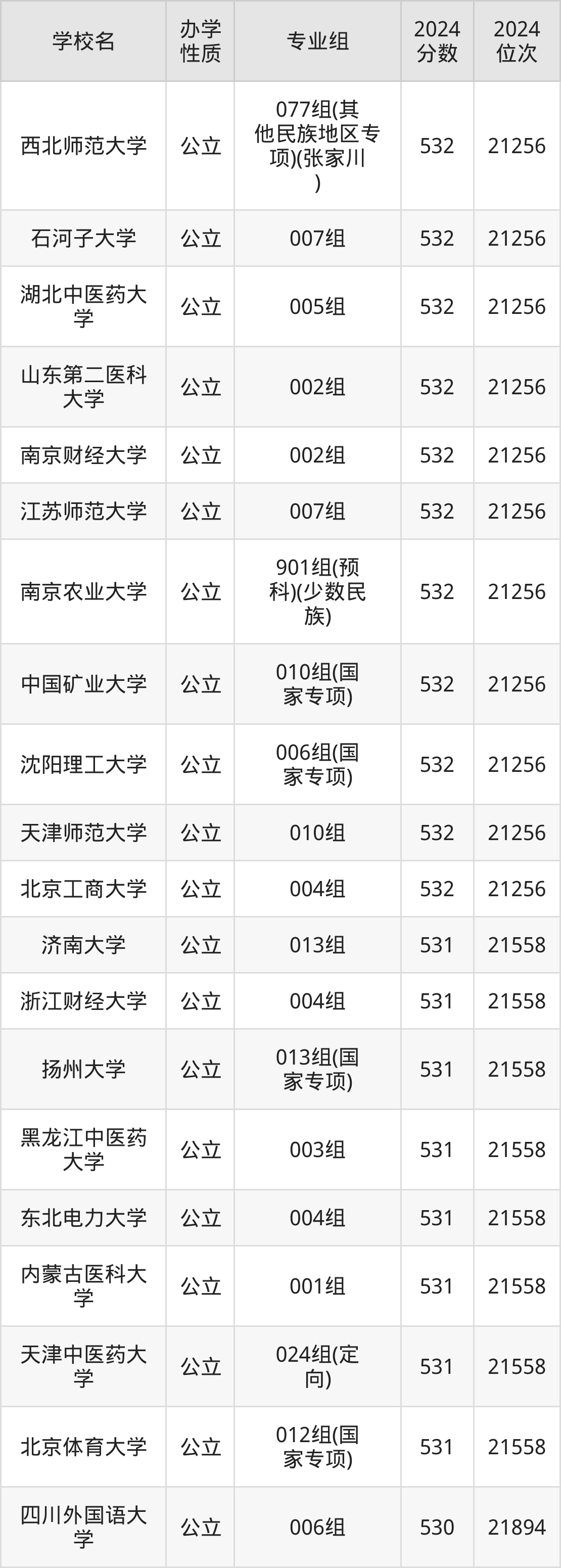 | 南京农业大学 | 901组(预 科)(少数民 族) | 532 | 21256 |