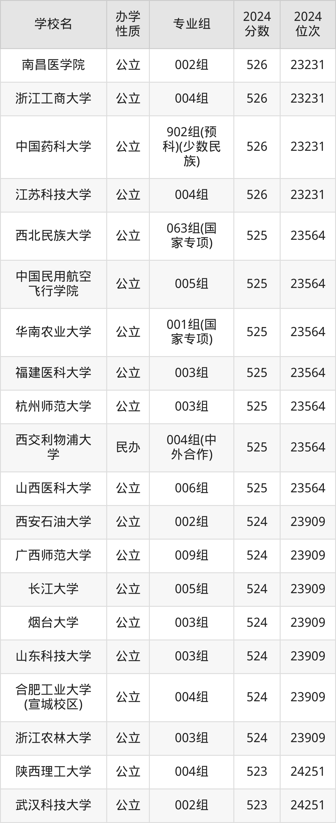 | 中国药科大学 | 902组(预 科)(少数民 族) | 526 | 23231 |