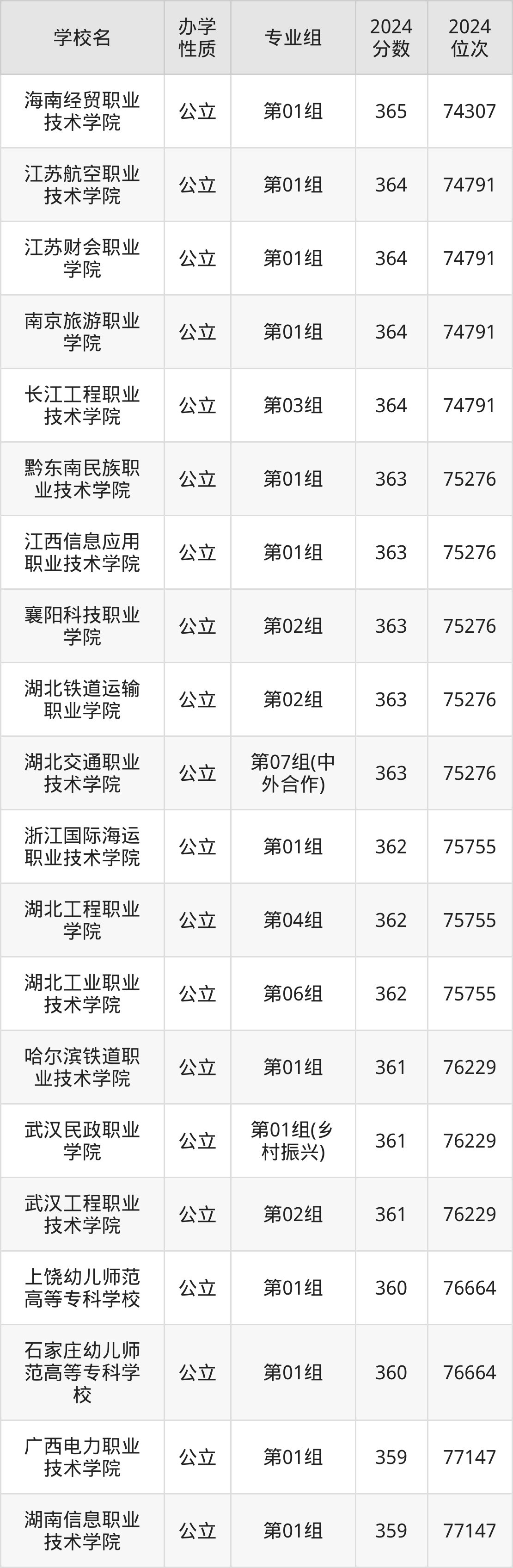 2024年湖北历史类360分考生能上海南经贸职业技术学院、江苏航空职业技术学院、江苏财会职业学院、南京旅游职业学院、长江工程职业技术学院等35所专科院校,具体录取分数线及位次为: