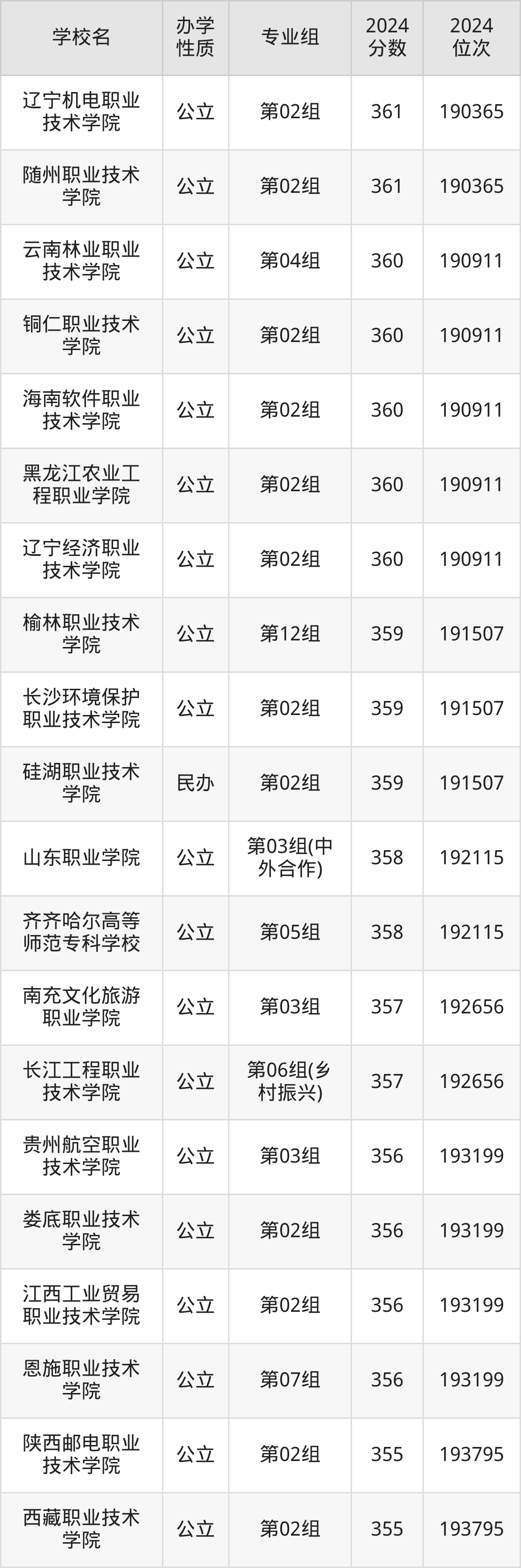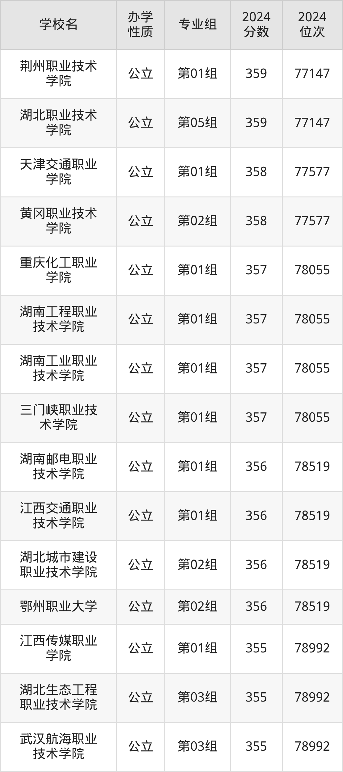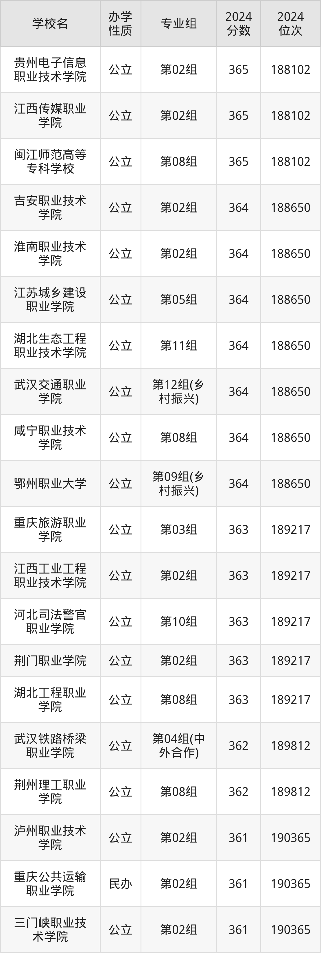 湖北360分左右的考生可以上贵州电子信息职业技术学院、江西传媒职业学院、闽江师范高等专科学校等院校,刚好在360分的院校有云南林业职业技术学院、铜仁职业技术学院、海南软件职业技术学院等。