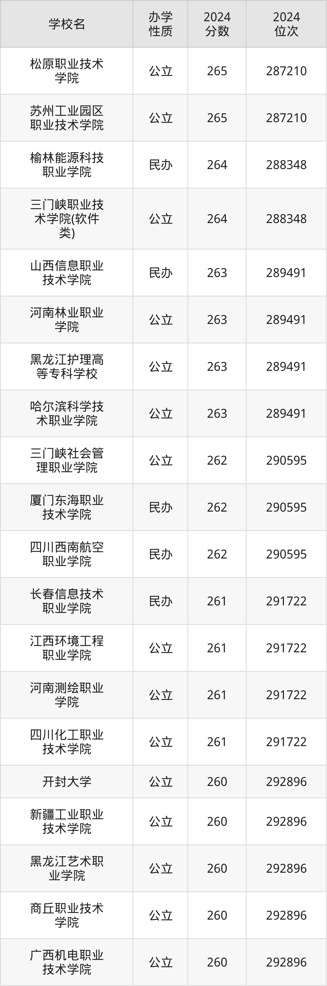 2024年河南文科260分考生能上松原职业技术学院、苏州工业园区职业技术学院、榆林能源科技职业学院、三门峡职业技术学院(软件类)、山西信息职业技术学院等42所专科院校,具体录取分数线及位次为: