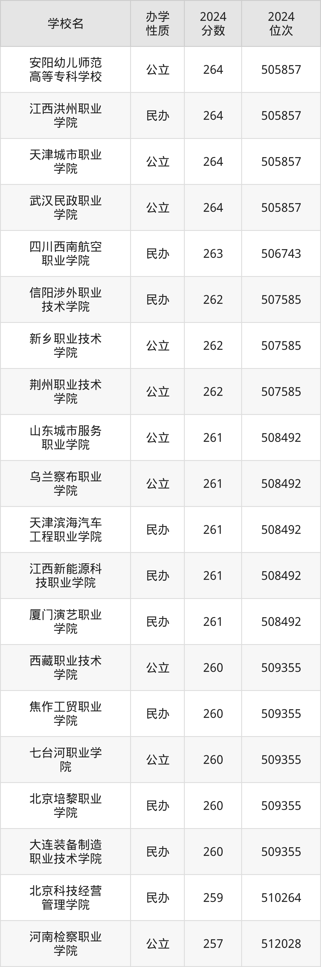 2024年河南理科260分考生能上安阳幼儿师范高等专科学校、江西洪州职业学院、天津城市职业学院、武汉民政职业学院、四川西南航空职业学院等29所专科院校,具体录取分数线及位次为: