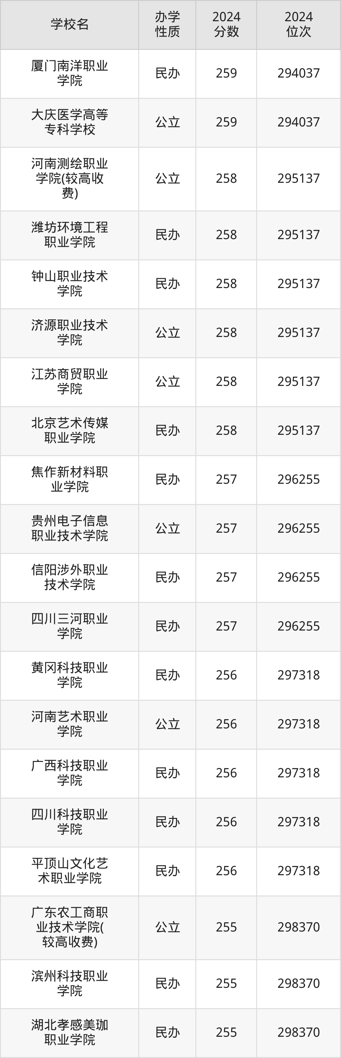 | 四川科技职业 学院 | 256 | 297318 |