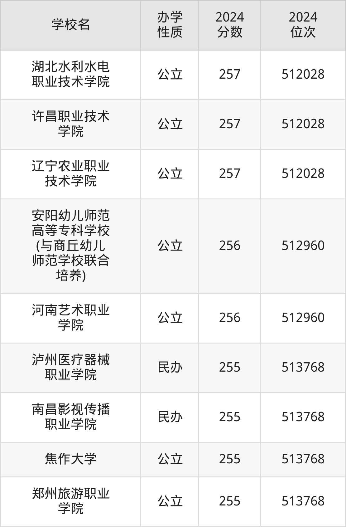 | 许昌职业技术 学院 | 257 | 512028 |