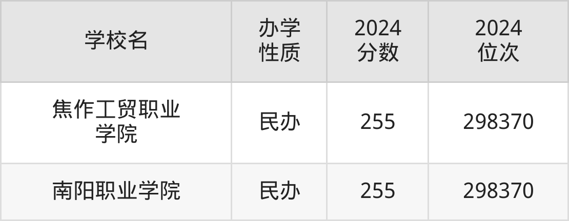 | 焦作工贸职业 学院 | 255 | 298370 |