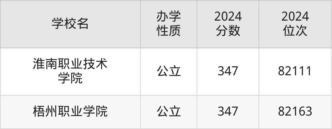 | 安徽电子信息 职业技术学院 | 357 | 78850 |