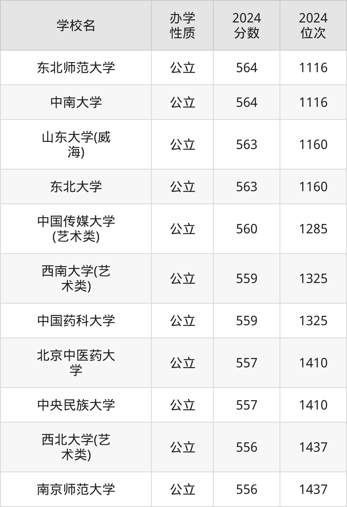 2024年内蒙古文科560分考生能上南京师范大学、中央民族大学、北京中医药大学、中国药科大学、东北大学等8所211院校,具体录取分数线及位次为: