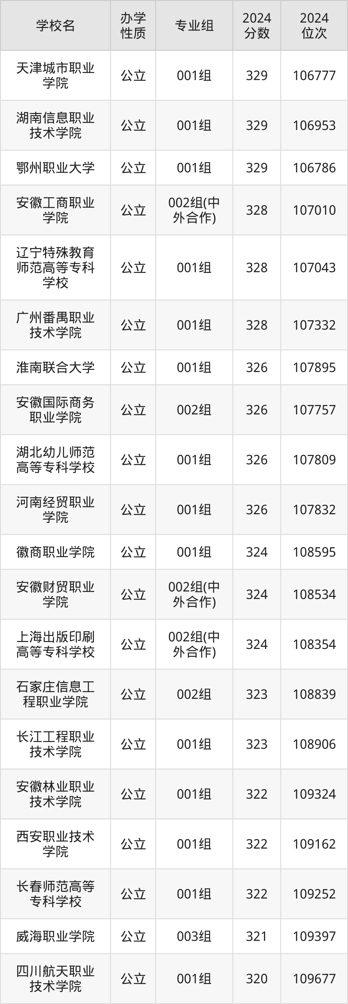2024年安徽历史类324分考生能上天津城市职业学院、湖南信息职业技术学院、鄂州职业大学、安徽工商职业学院、辽宁特殊教育师范高等专科学校等25所专科院校,具体录取分数线及位次为: