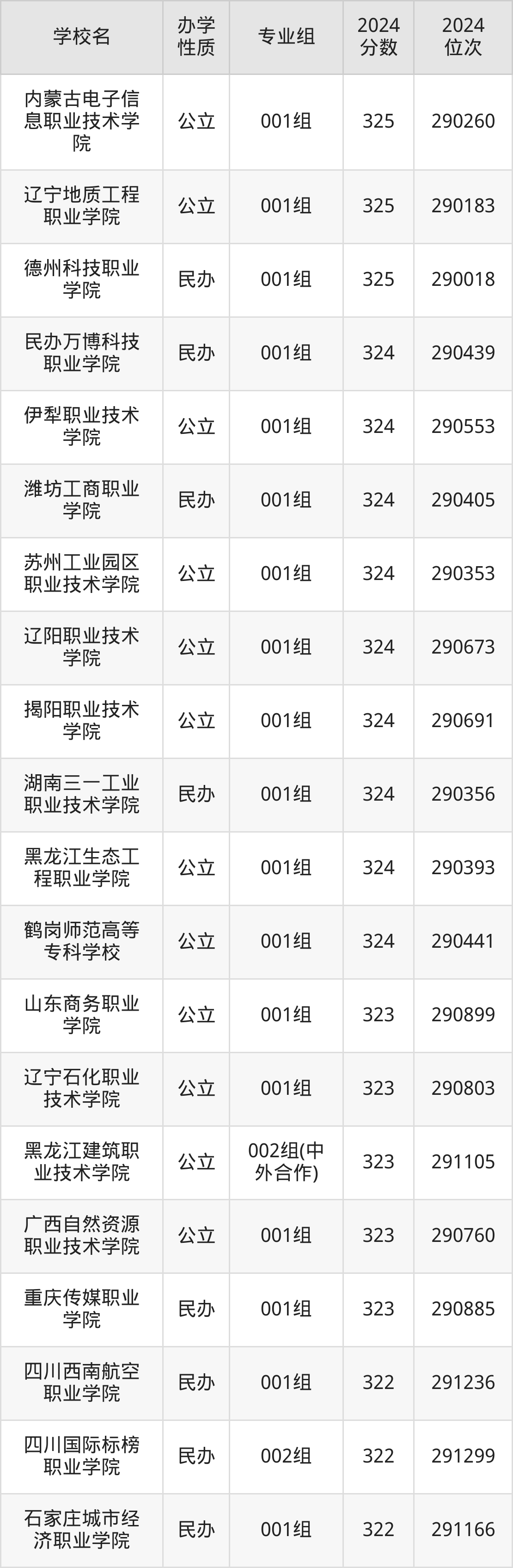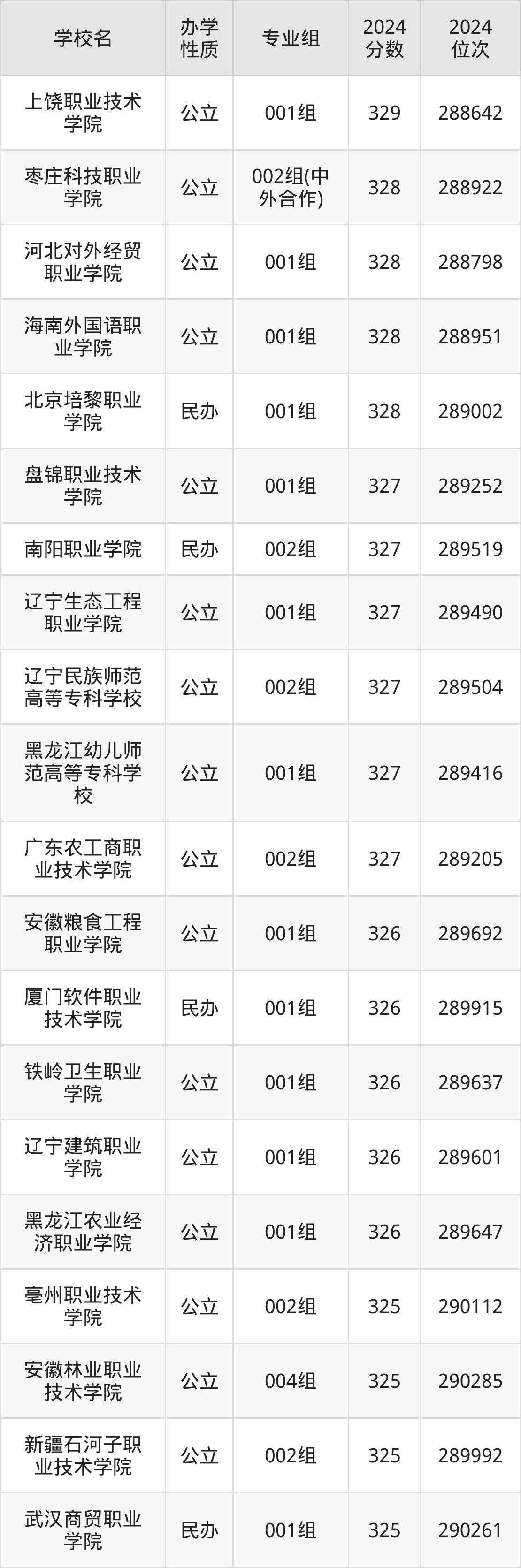 2024年安徽物理类324分考生能上上饶职业技术学院、枣庄科技职业学院、河北对外经贸职业学院、海南外国语职业学院、北京培黎职业学院等51所专科院校,具体录取分数线及位次为: