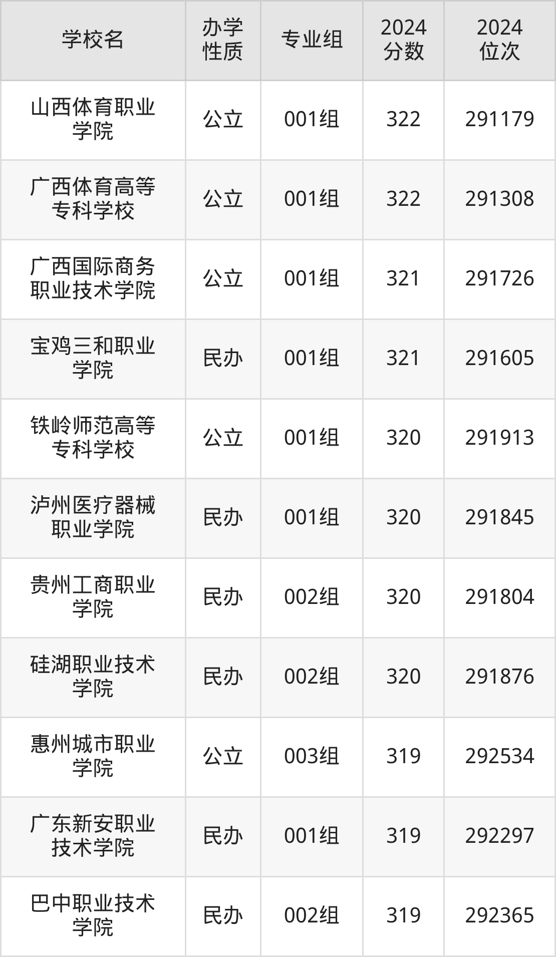 | 广西体育高等 专科学校 | 001组 | 322 | 291308 |