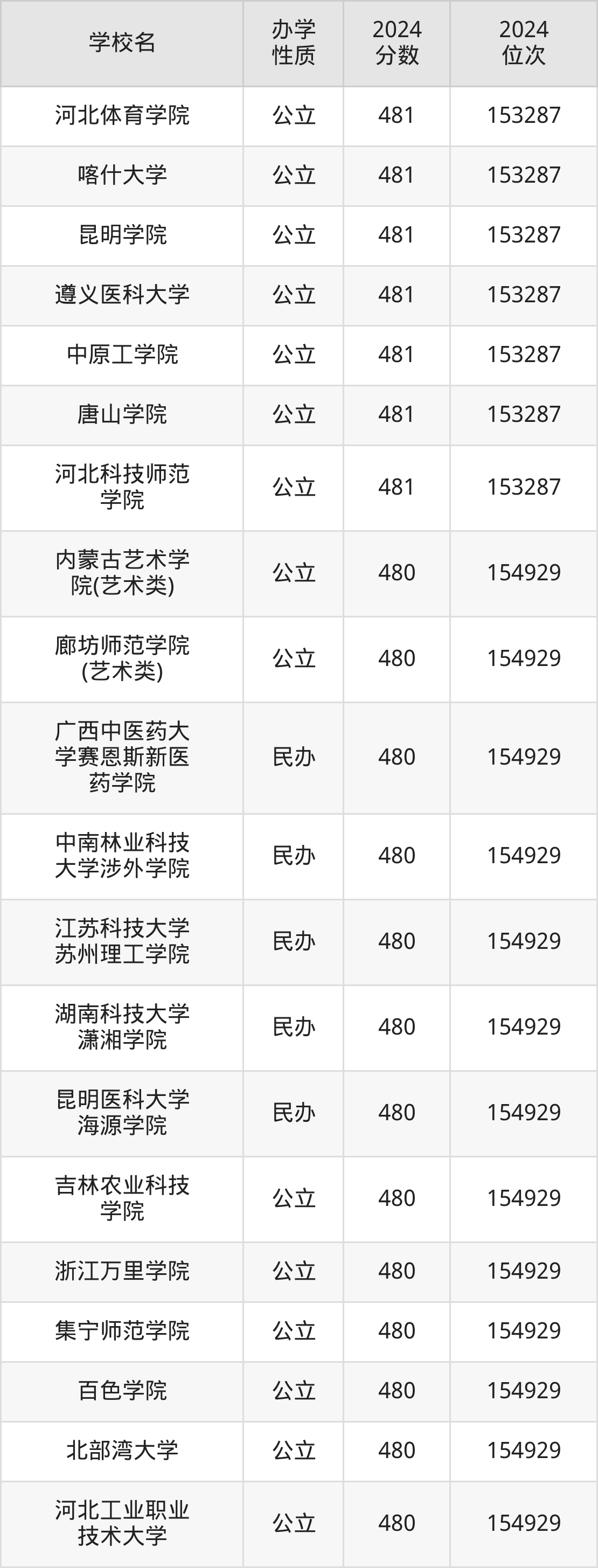 2024年河北物理类480分考生能上保定学院(艺术类)、吉林警察学院、沧州师范学院、黑河学院、河西学院等166所二本院校,具体录取分数线及位次为: