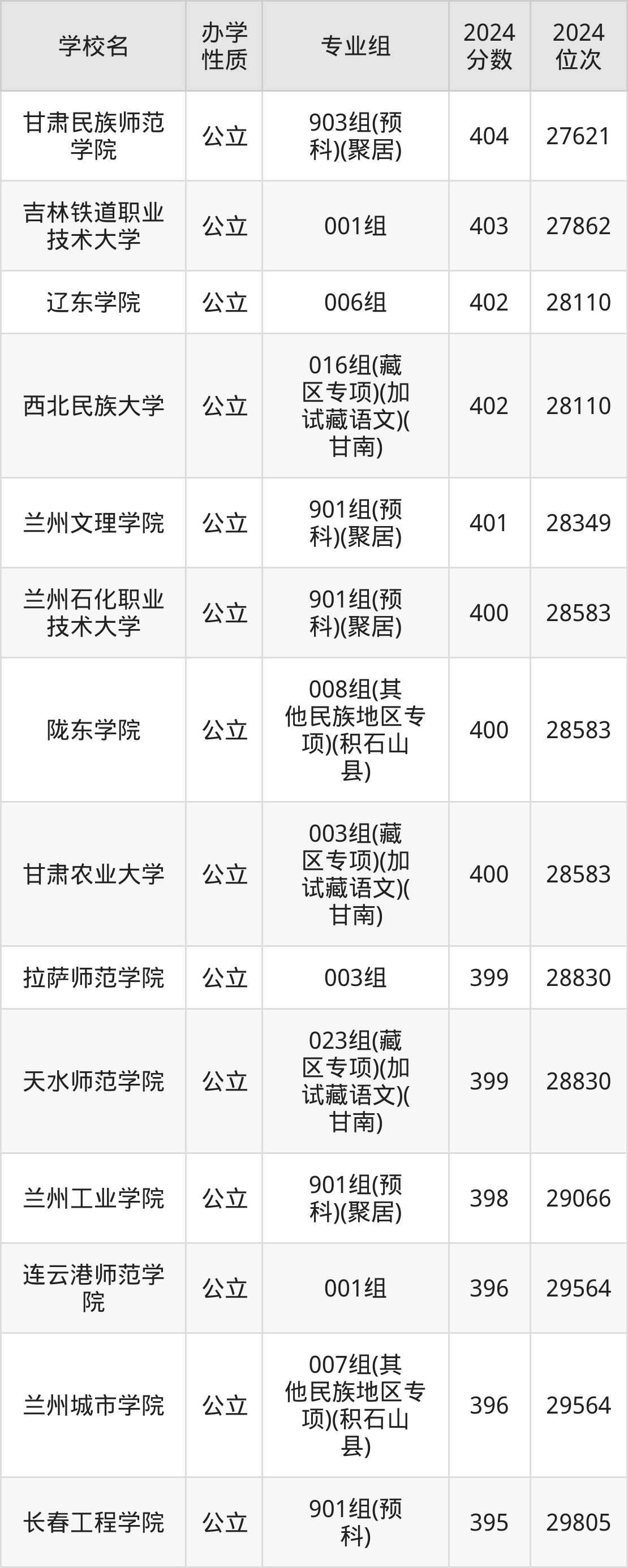 2024年甘肃历史类400分考生能上甘肃民族师范学院、西北民族大学、兰州文理学院、兰州石化职业技术大学、陇东学院等10所二本院校,具体录取分数线及位次为: