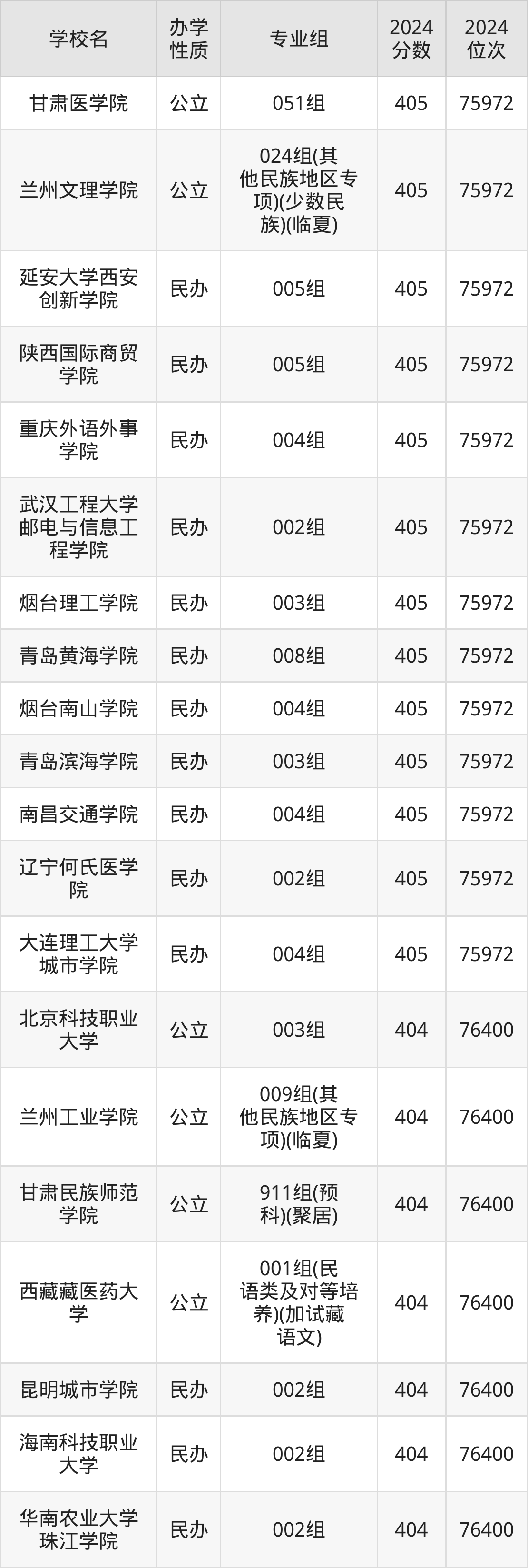 | 兰州文理学院 | 024组(其 他民族地区专 项)(少数民 族)(临夏) | 405 | 75972 |