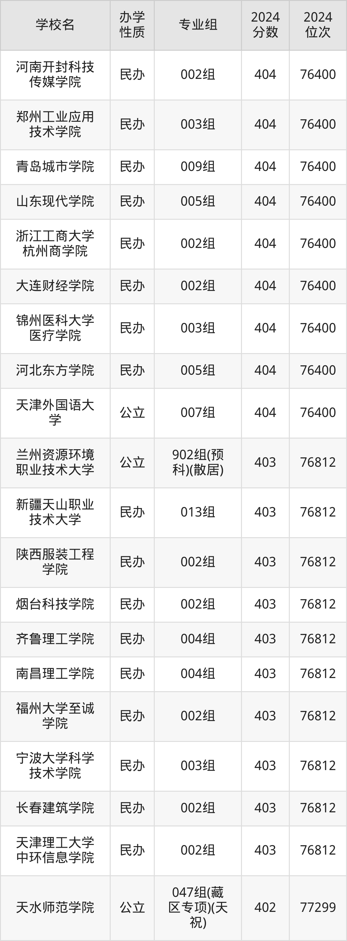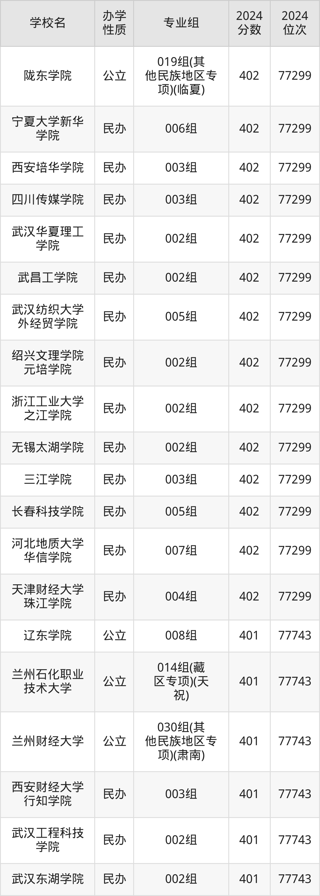| 兰州工业学院 | 009组(其 他民族地区专 项)(临夏) | 404 | 76400 |