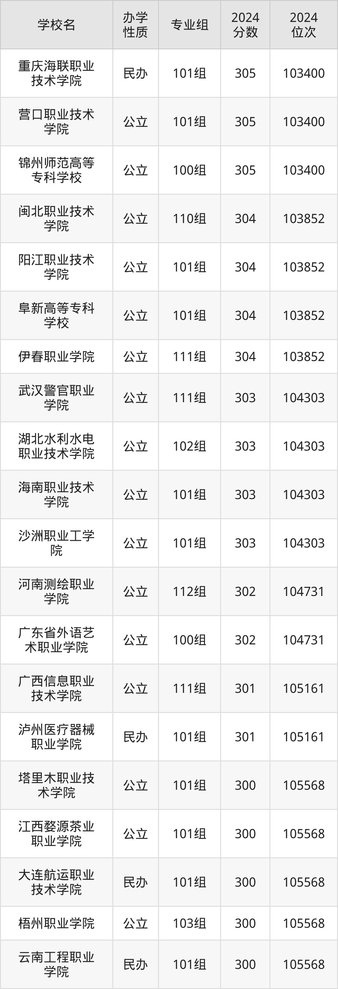 2024年广西历史类300分考生能上重庆海联职业技术学院、营口职业技术学院、锦州师范高等专科学校、闽北职业技术学院、阳江职业技术学院等39所专科院校,具体录取分数线及位次为: