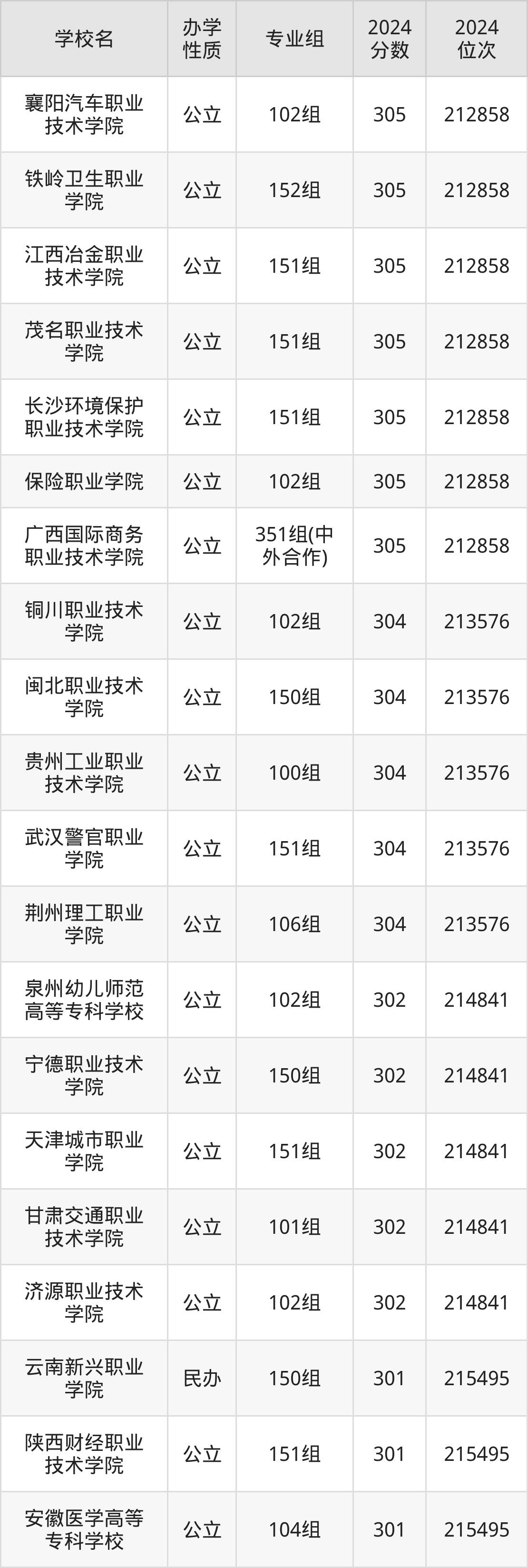 2024年广西物理类300分考生能上襄阳汽车职业技术学院、铁岭卫生职业学院、江西冶金职业技术学院、茂名职业技术学院、长沙环境保护职业技术学院等45所专科院校,具体录取分数线及位次为:
