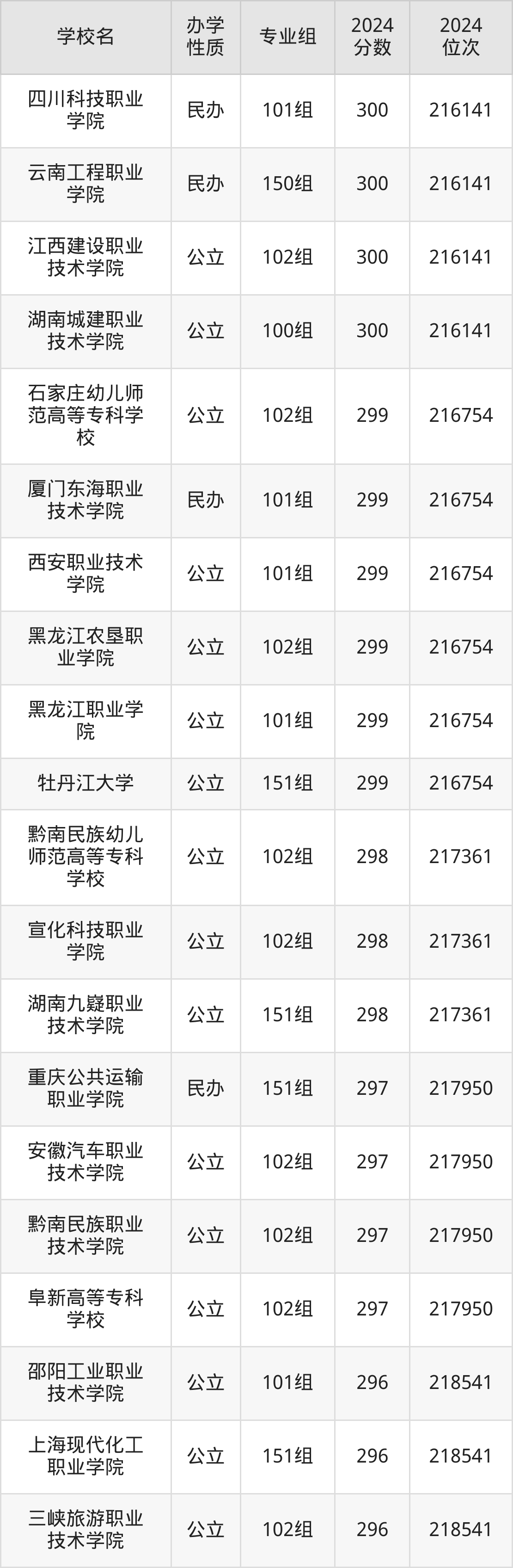 | 重庆公共运输 职业学院 | 151组 | 297 | 217950 |