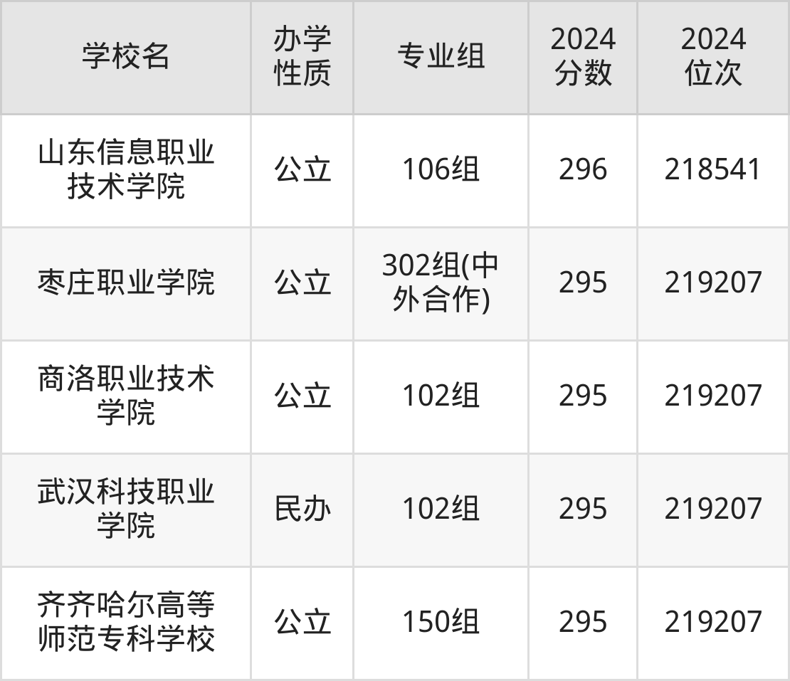 | 枣庄职业学院 | 302组(中 外合作) | 295 | 219207 |