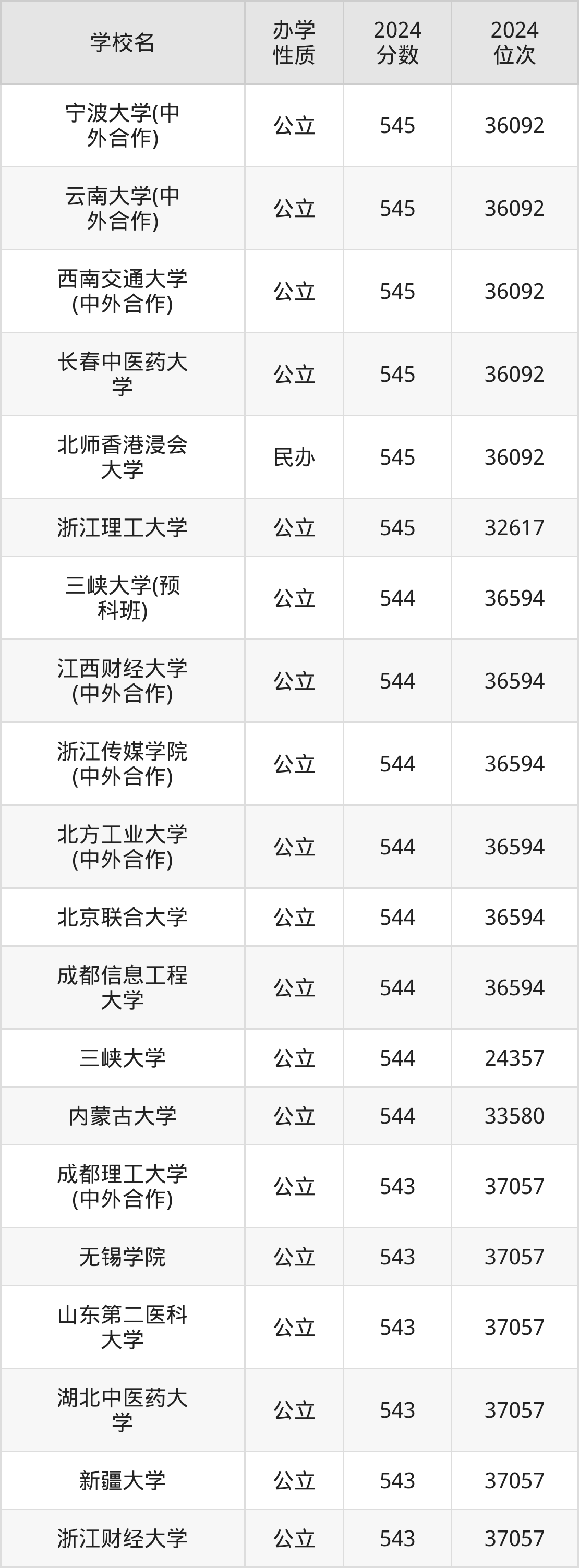 | 宁波大学(中 外合作) | 545 | 36092 |