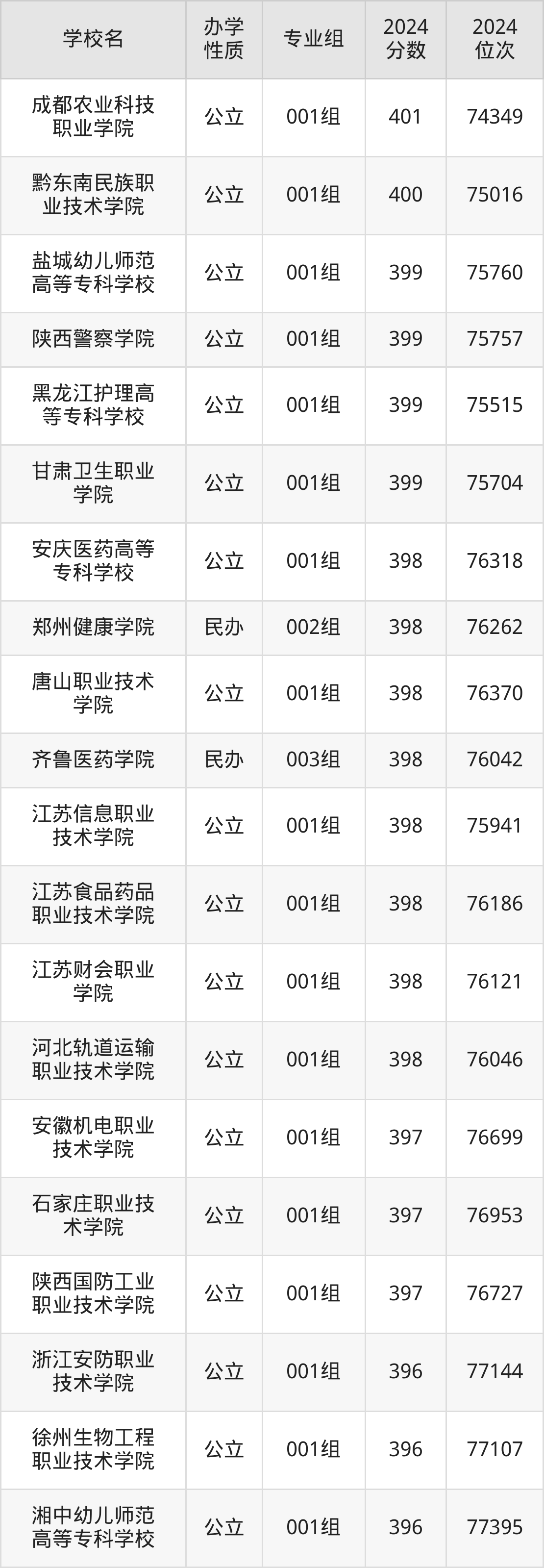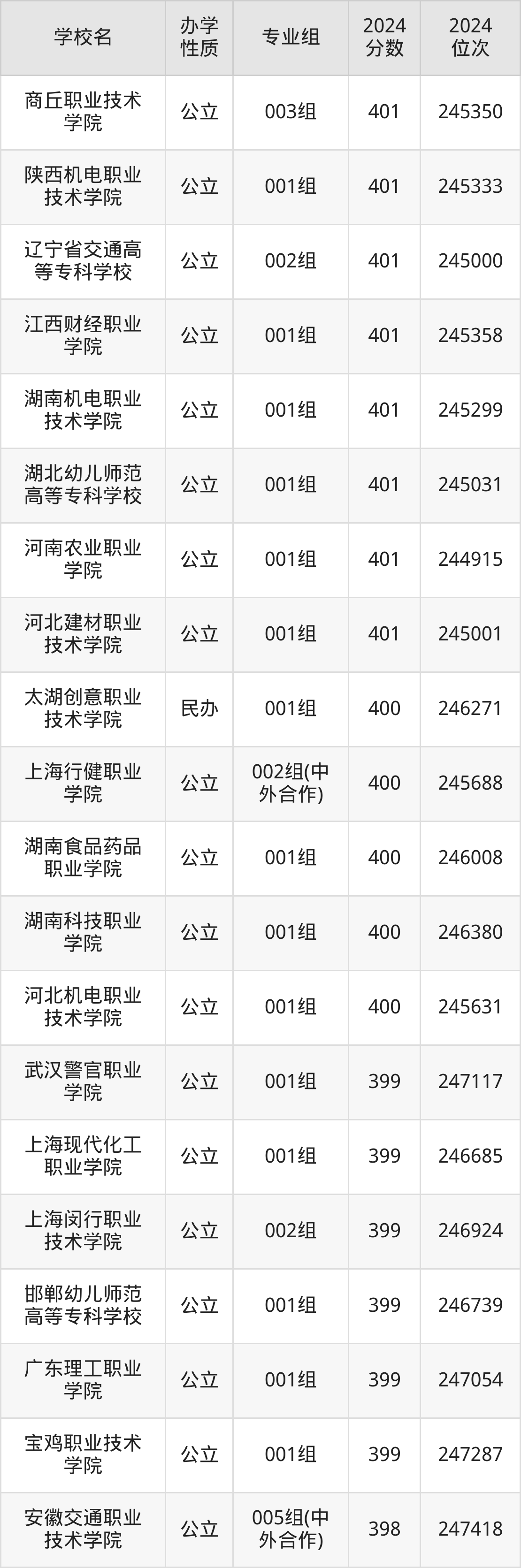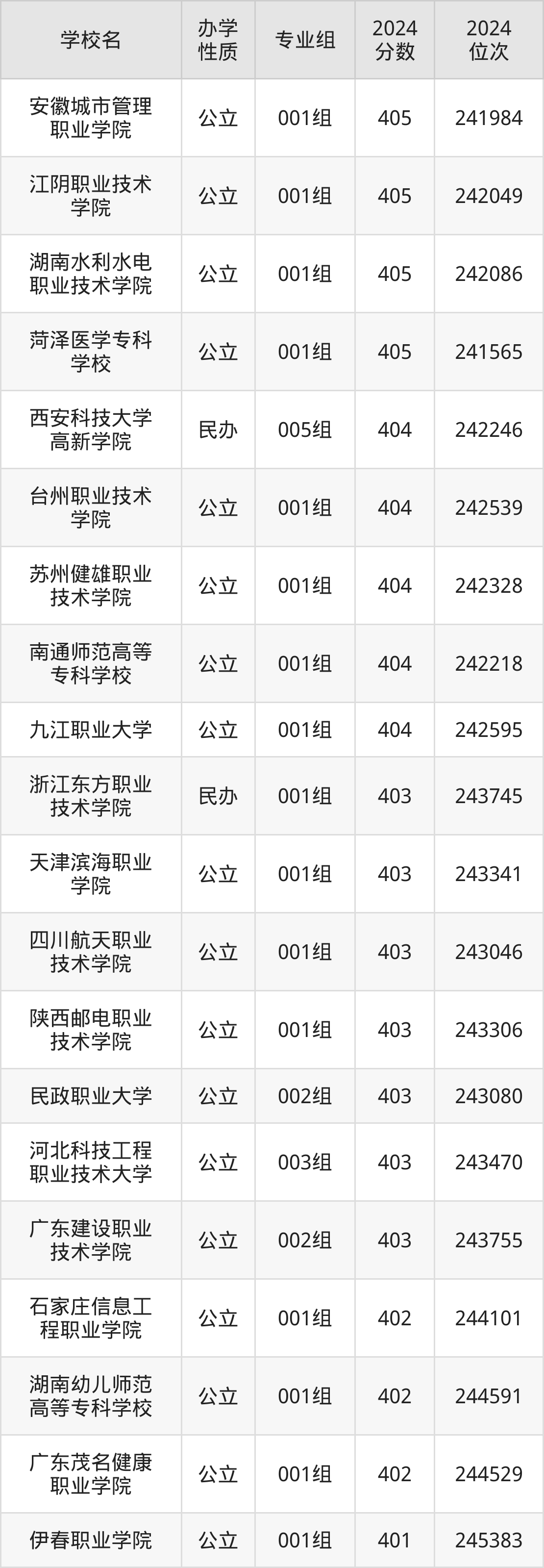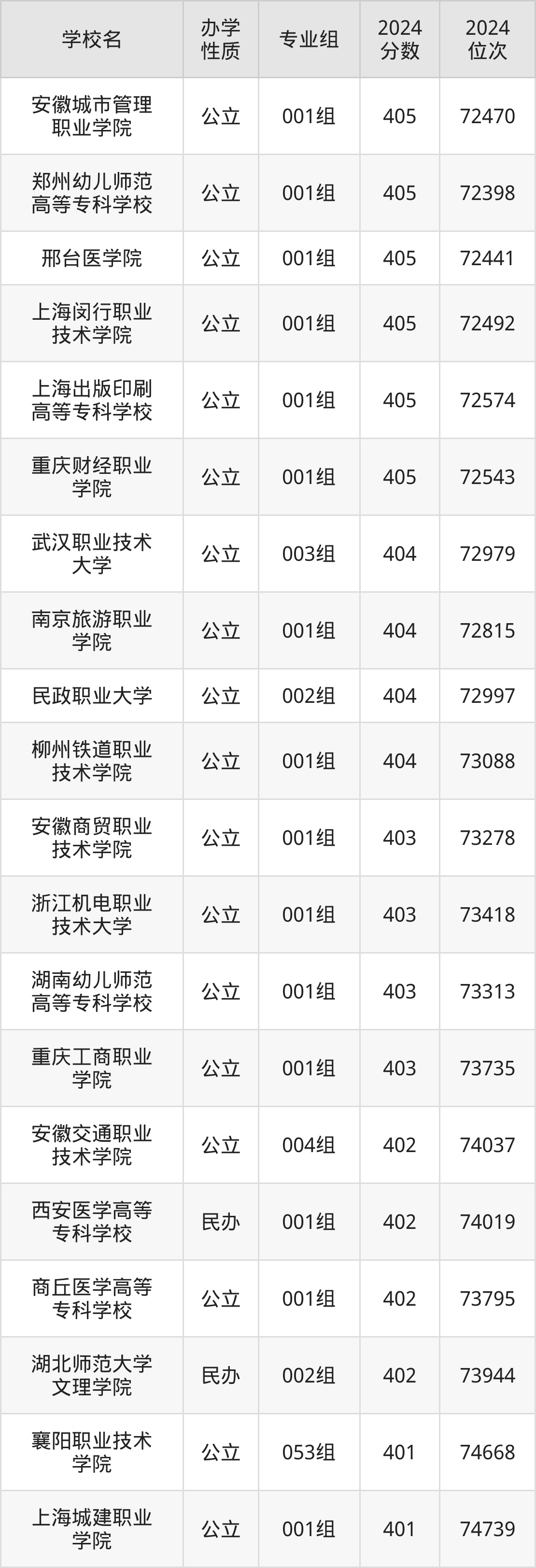 安徽400分左右的考生可以上安徽城市管理职业学院、江阴职业技术学院、湖南水利水电职业技术学院等院校,刚好在400分的院校有太湖创意职业技术学院、上海行健职业学院、湖南食品药品职业学院等。