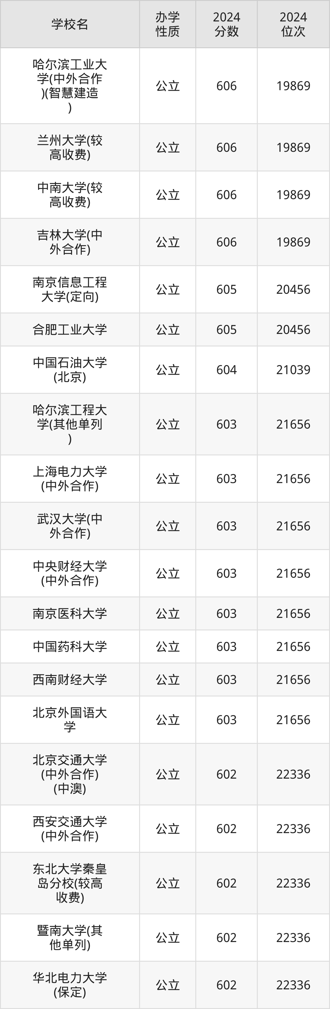 河南601分左右的考生可以上哈尔滨工业大学(中外合作)(智慧建造)、兰州大学(较高收费)、中南大学(较高收费)等院校,刚好在601分的院校有重庆医科大学(中外合作)、东北大学(中外合作)、郑州大学等。