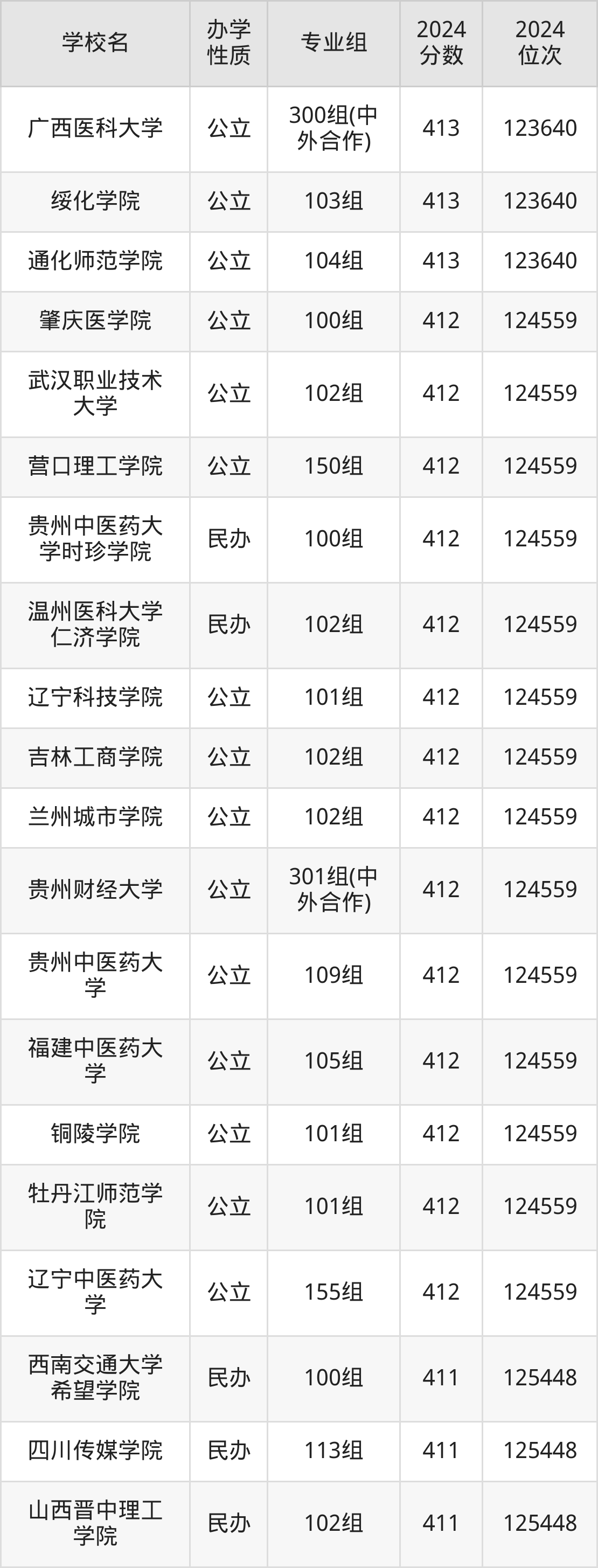 2024年广西物理类411分考生能上广西农业职业技术大学、四川工业科技学院、电子科技大学成都学院、广西中医药大学赛恩斯新医药学院、南宁师范大学师园学院等127所二本院校,具体录取分数线及位次为: