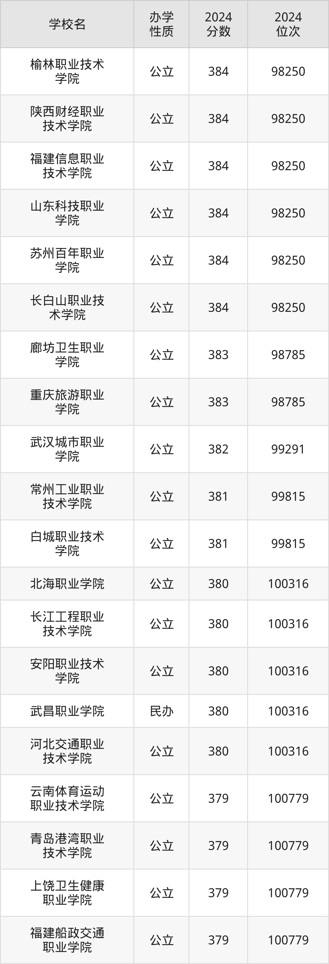 2024年云南文科379分考生能上榆林职业技术学院、陕西财经职业技术学院、福建信息职业技术学院、山东科技职业学院、苏州百年职业学院等30所专科院校,具体录取分数线及位次为: