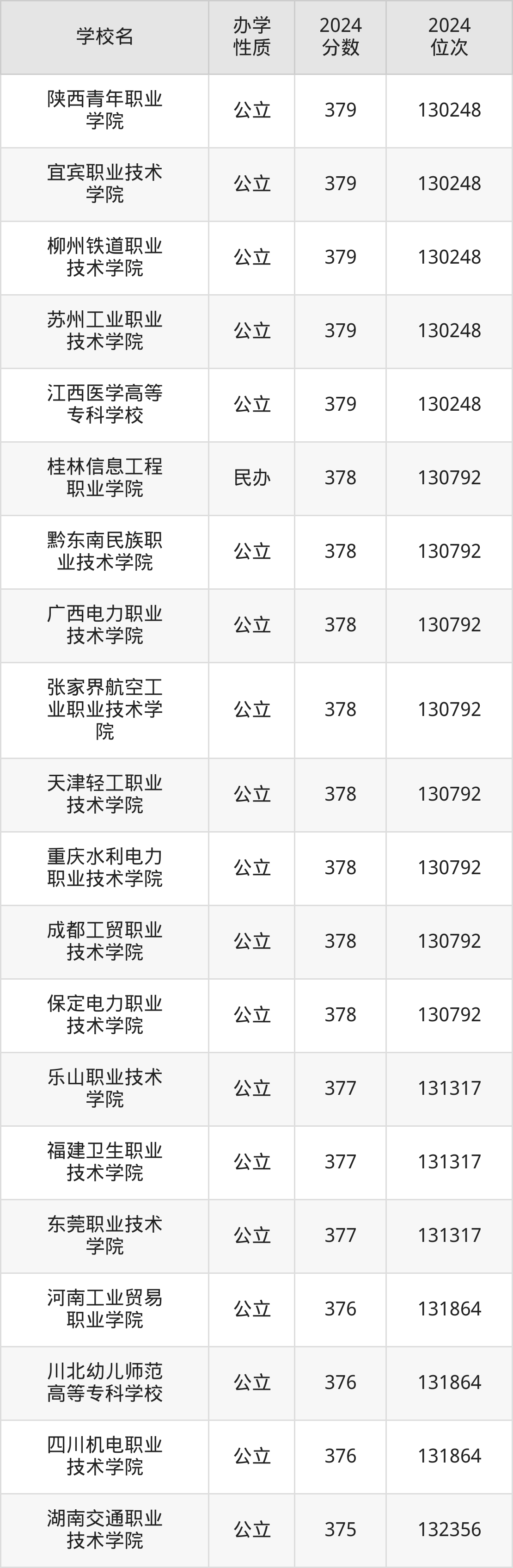 | 宜宾职业技术 学院 | 379 | 130248 |