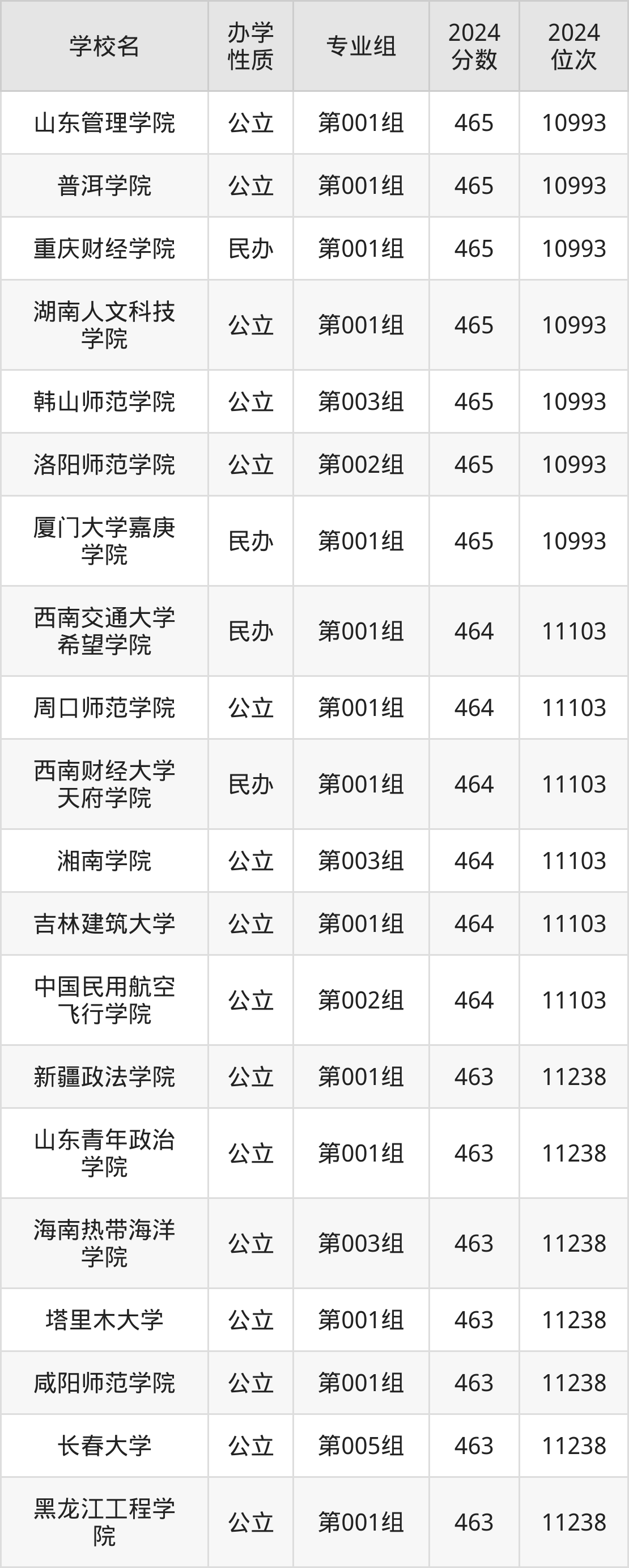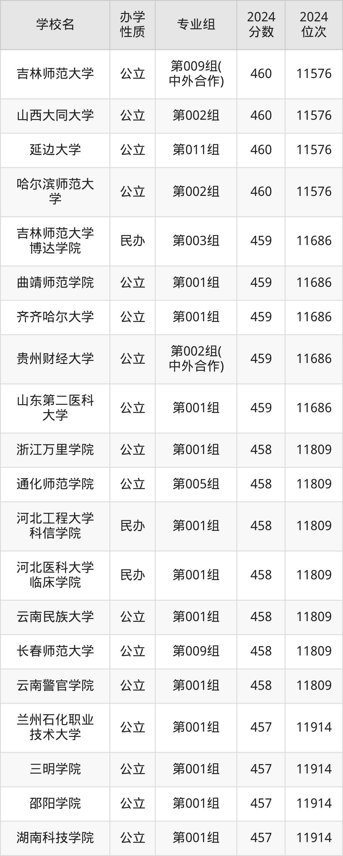 2024年吉林历史类460分考生能上山东管理学院、普洱学院、重庆财经学院、湖南人文科技学院、韩山师范学院等76所二本院校,具体录取分数线及位次为: