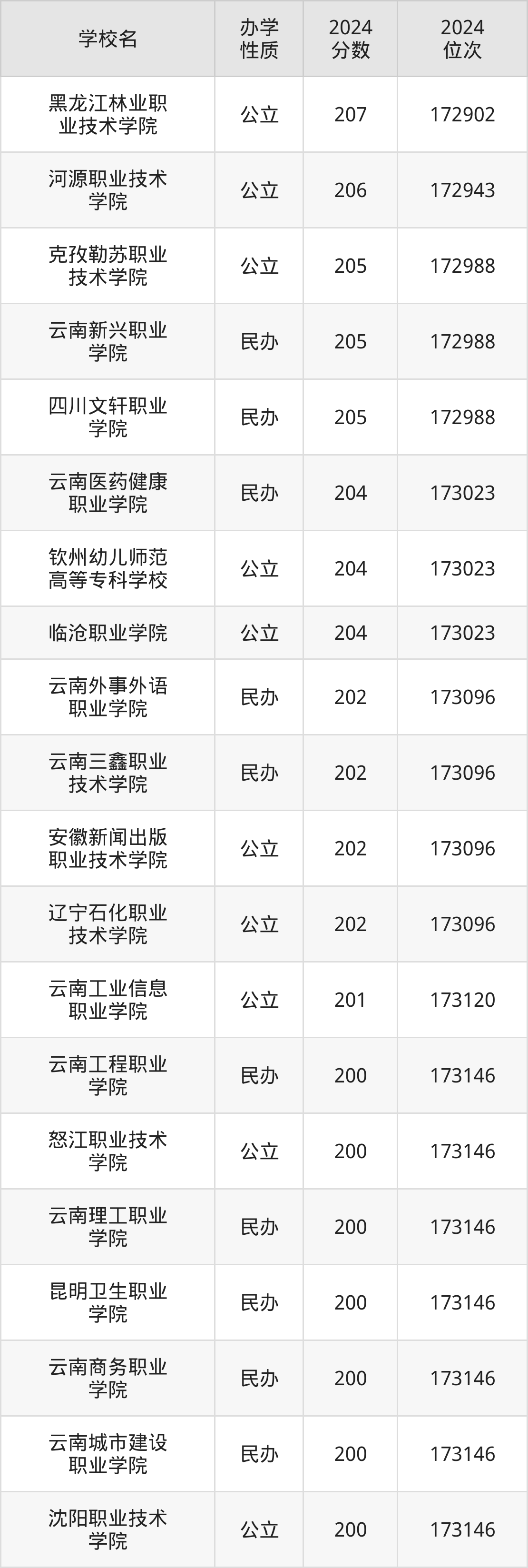 | 云南三鑫职业 技术学院 | 202 | 173096 |