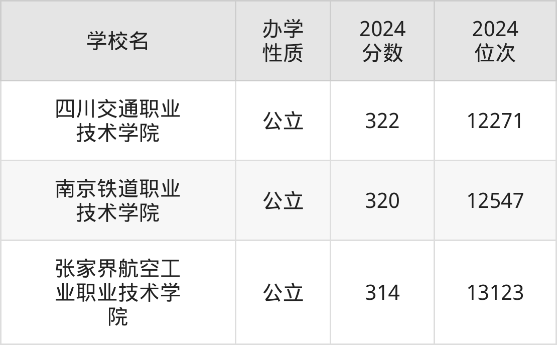 2024年新疆文科318分考生能上四川交通职业技术学院、南京铁道职业技术学院、张家界航空工业职业技术学院3所专科院校,具体录取分数线及位次为:
