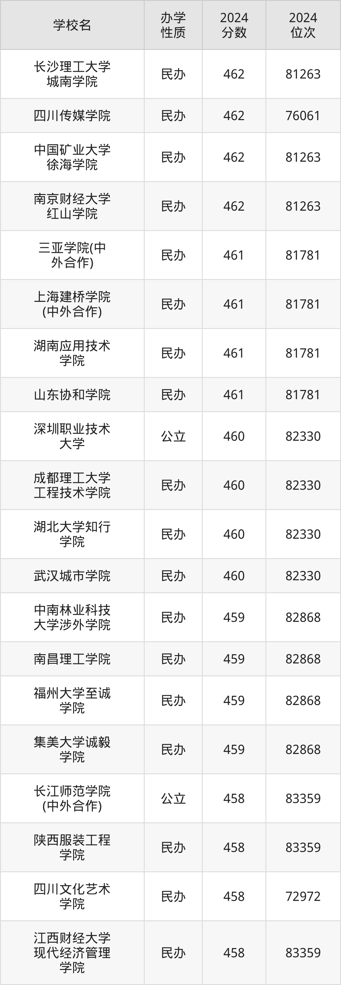 | 三亚学院(中 外合作) | 461 | 81781 |