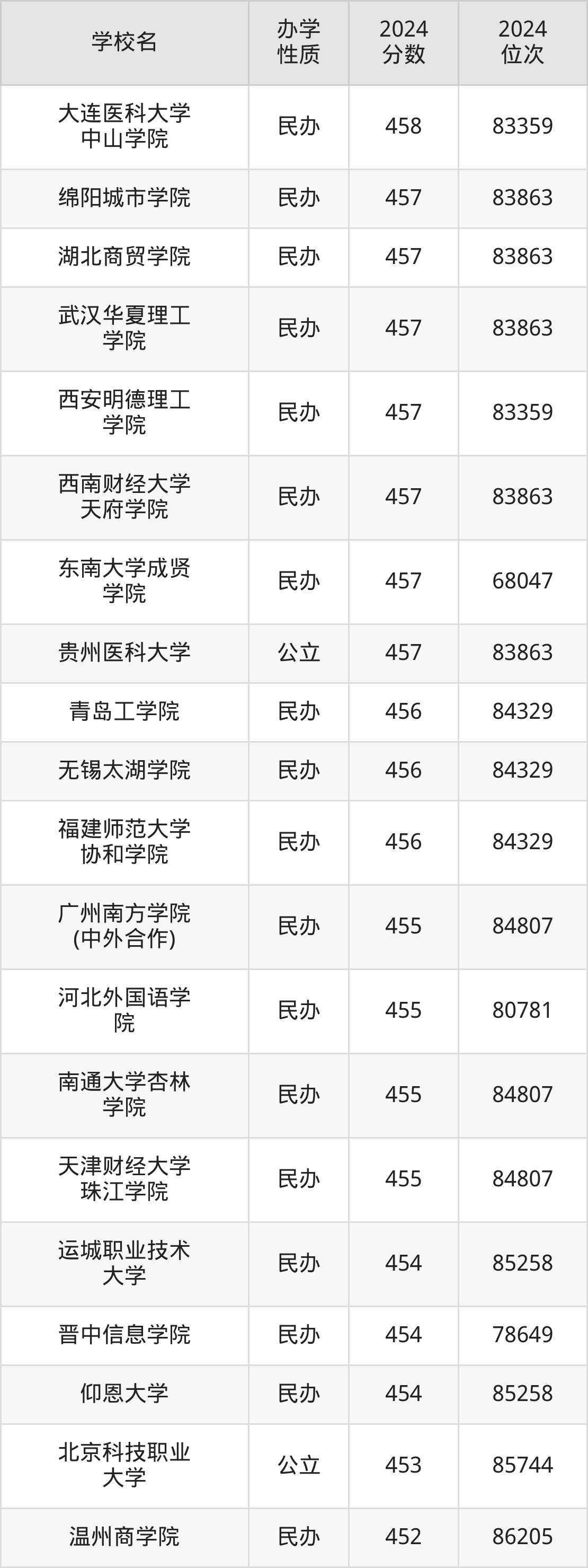 | 大连医科大学 中山学院 | 458 | 83359 |