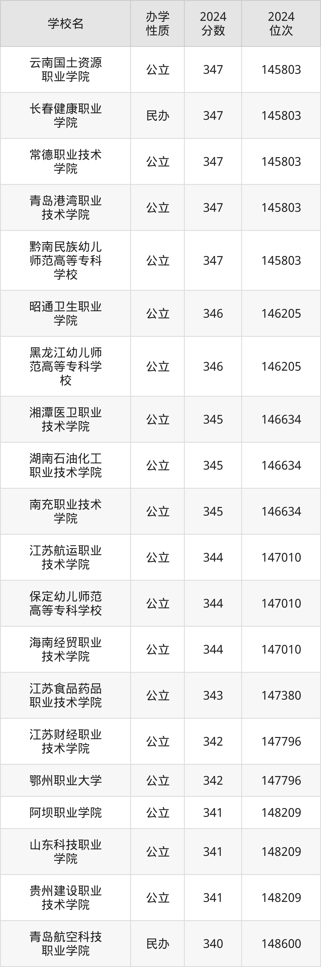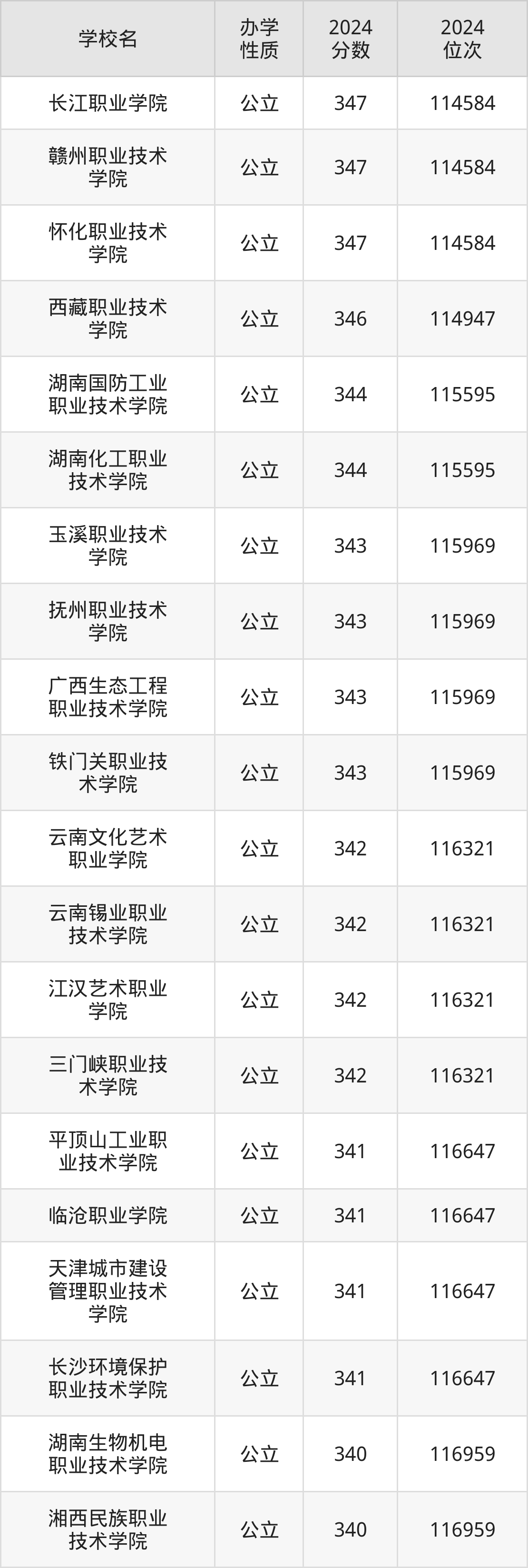 2024年云南文科342分考生能上长江职业学院、赣州职业技术学院、怀化职业技术学院、西藏职业技术学院、湖南国防工业职业技术学院等34所专科院校,具体录取分数线及位次为: