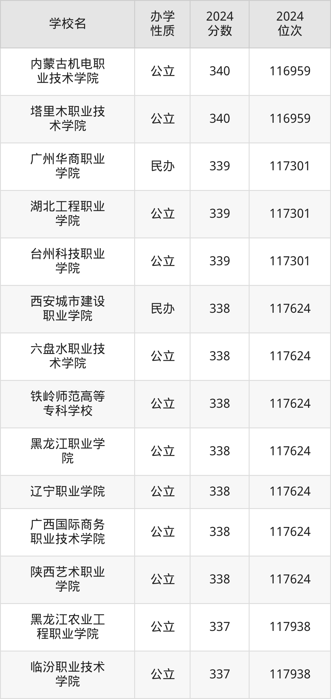| 陕西艺术职业 学院 | 338 | 117624 |