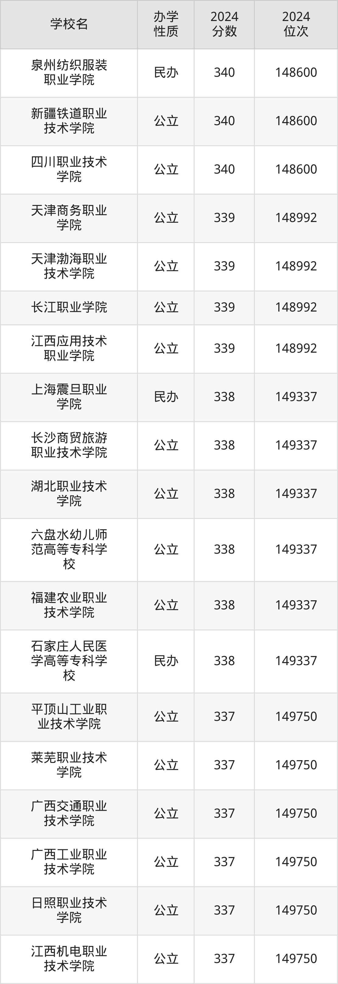 | 泉州纺织服装 职业学院 | 340 | 148600 |