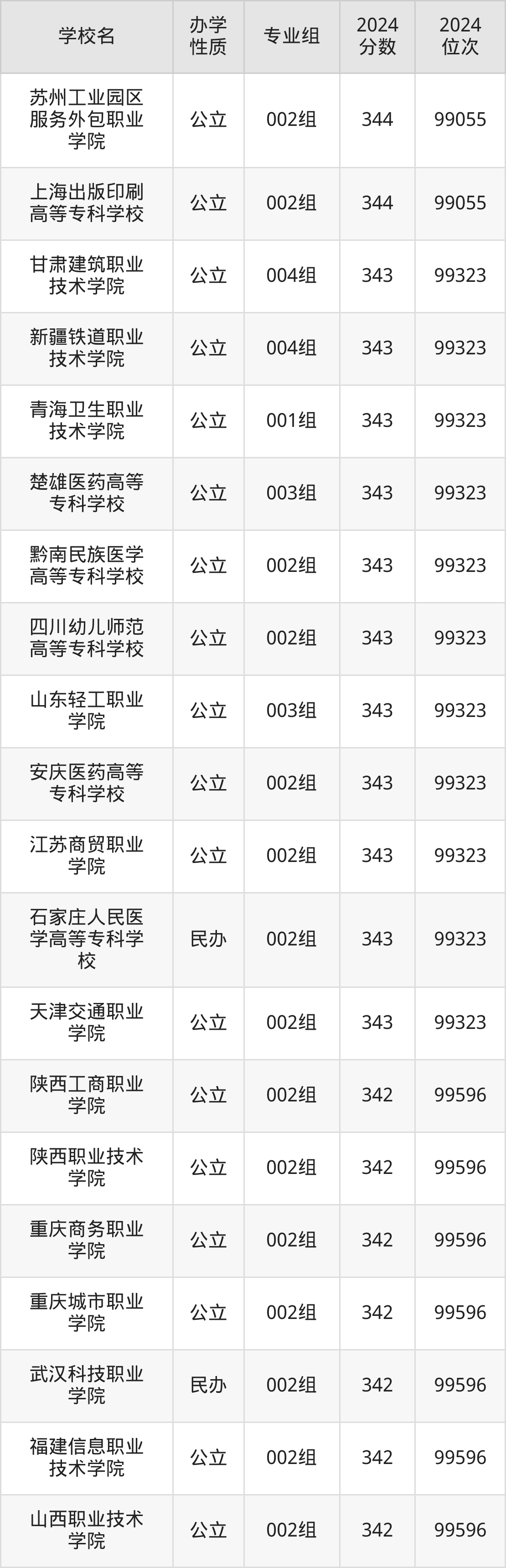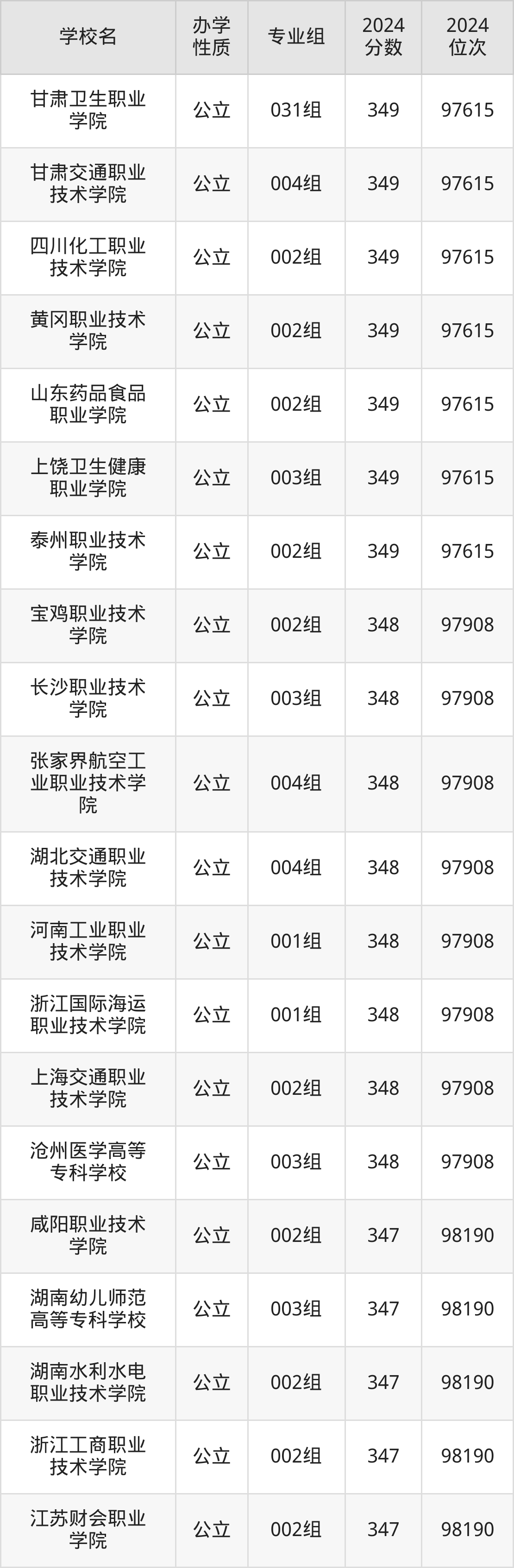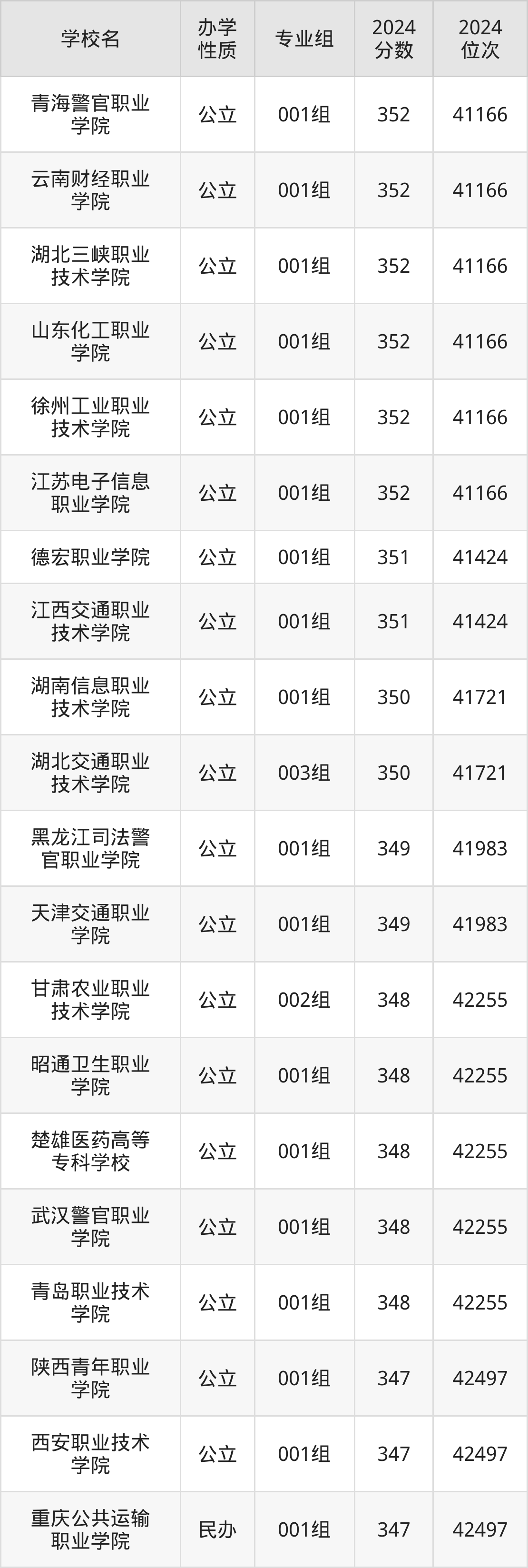 2024年甘肃历史类347分考生能上青海警官职业学院、云南财经职业学院、湖北三峡职业技术学院、山东化工职业学院、徐州工业职业技术学院等33所专科院校,具体录取分数线及位次为: