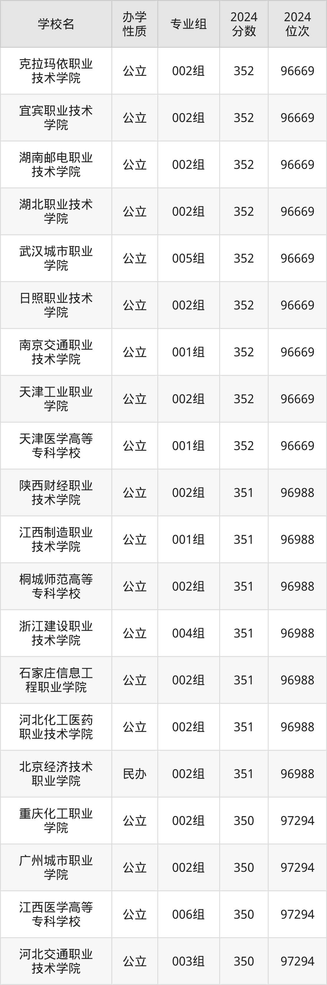 2024年甘肃物理类347分考生能上克拉玛依职业技术学院、宜宾职业技术学院、湖南邮电职业技术学院、湖北职业技术学院、武汉城市职业学院等82所专科院校,具体录取分数线及位次为: