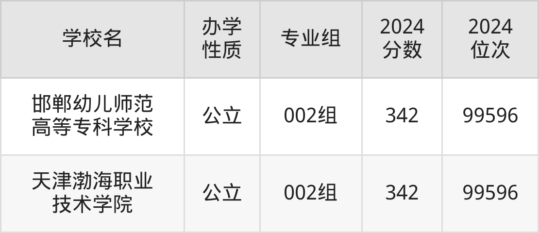 | 邯郸幼儿师范 高等专科学校 | 002组 | 342 | 99596 |