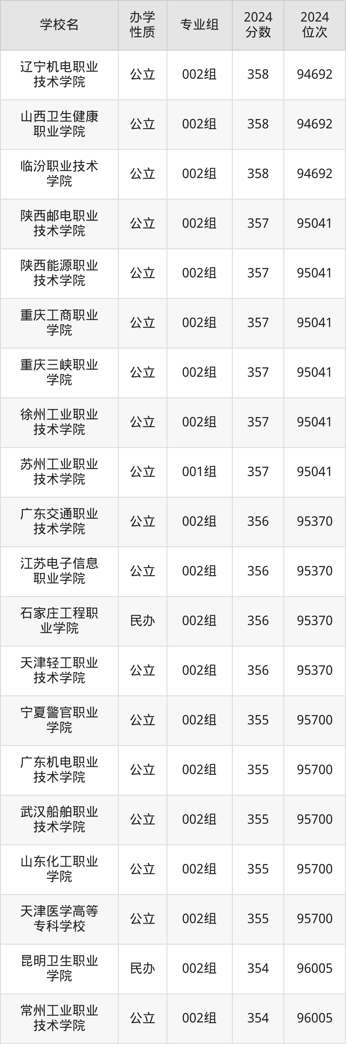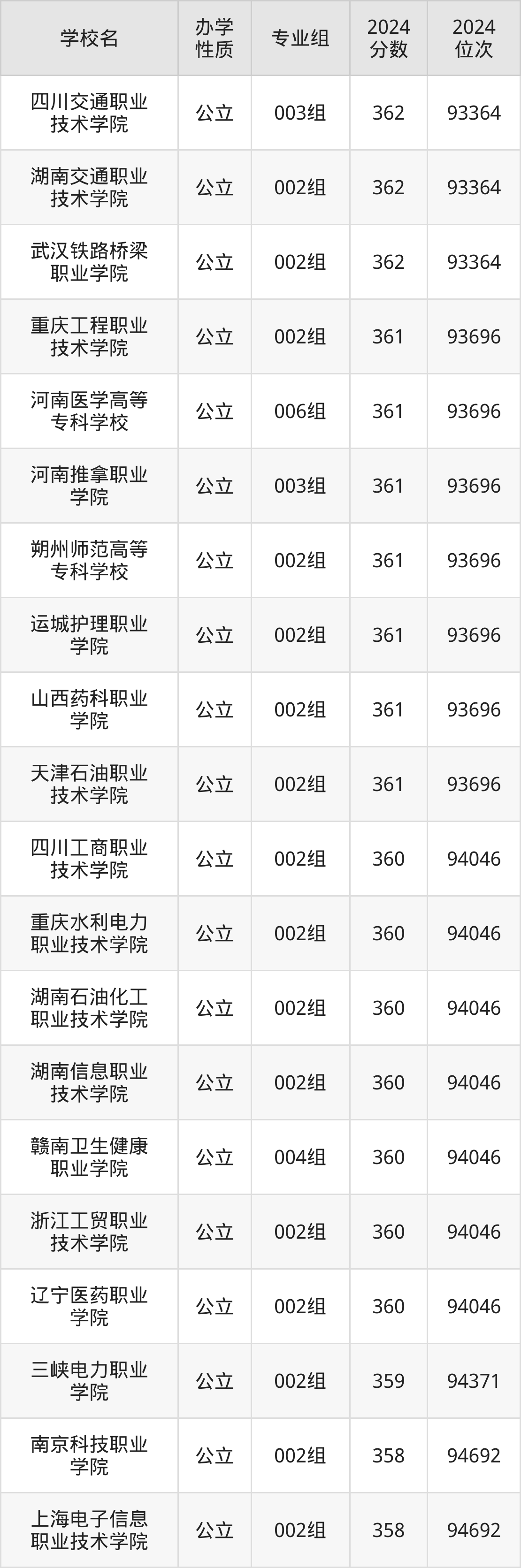 2024年甘肃物理类357分考生能上四川交通职业技术学院、湖南交通职业技术学院、武汉铁路桥梁职业学院、重庆工程职业技术学院、河南医学高等专科学校等58所专科院校,具体录取分数线及位次为: