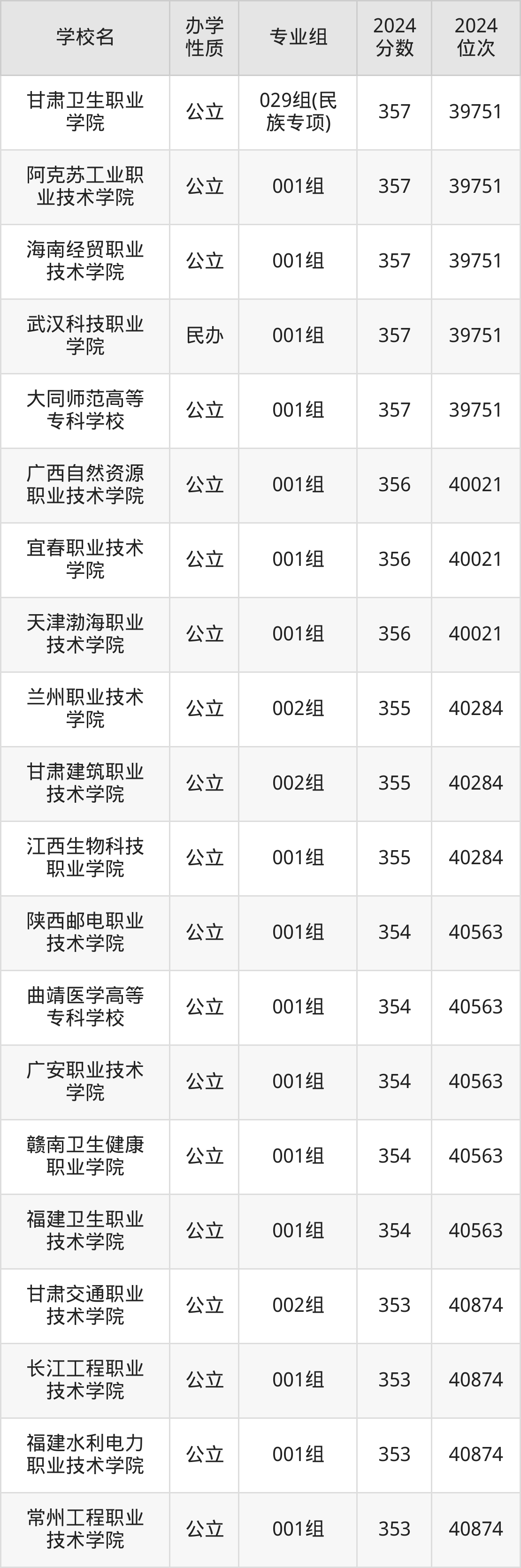 | 甘肃卫生职业 学院 | 029组(民 族专项) | 357 | 39751 |