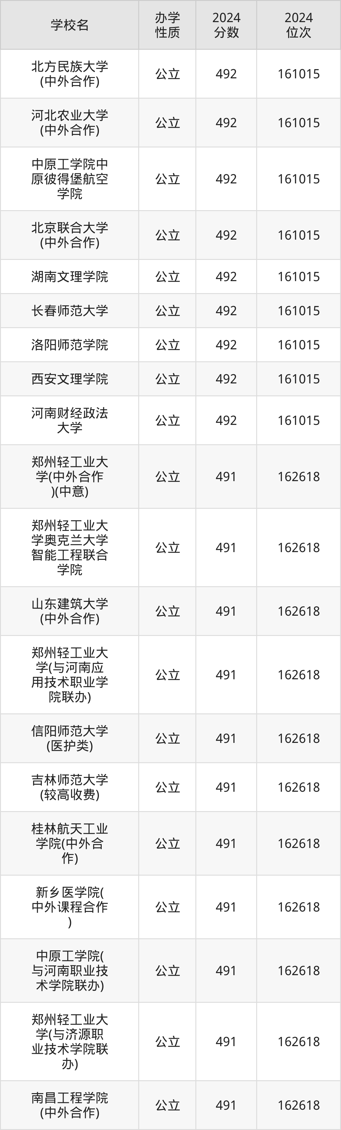 | 北方民族大学 (中外合作) | 492 | 161015 |